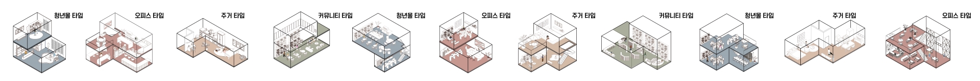 유닛 타입은 청년몰 / 오피스 / 주거 / 커뮤니티로 나뉜다.