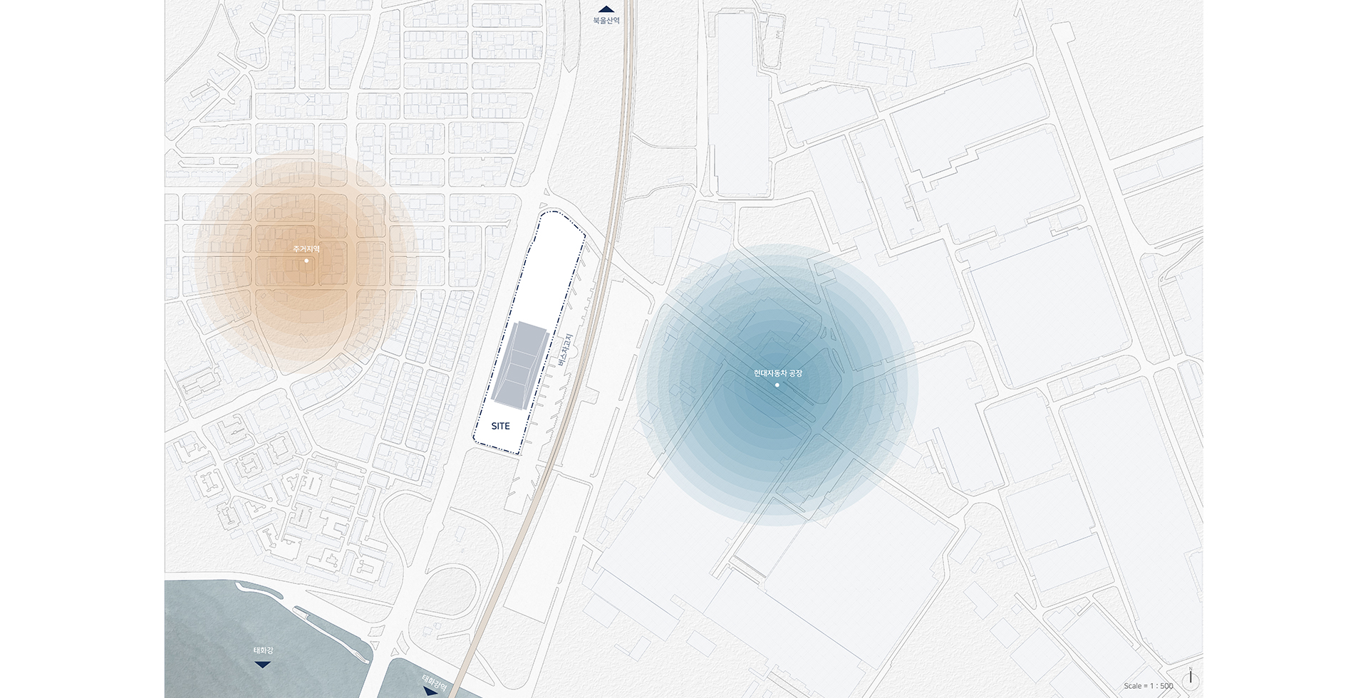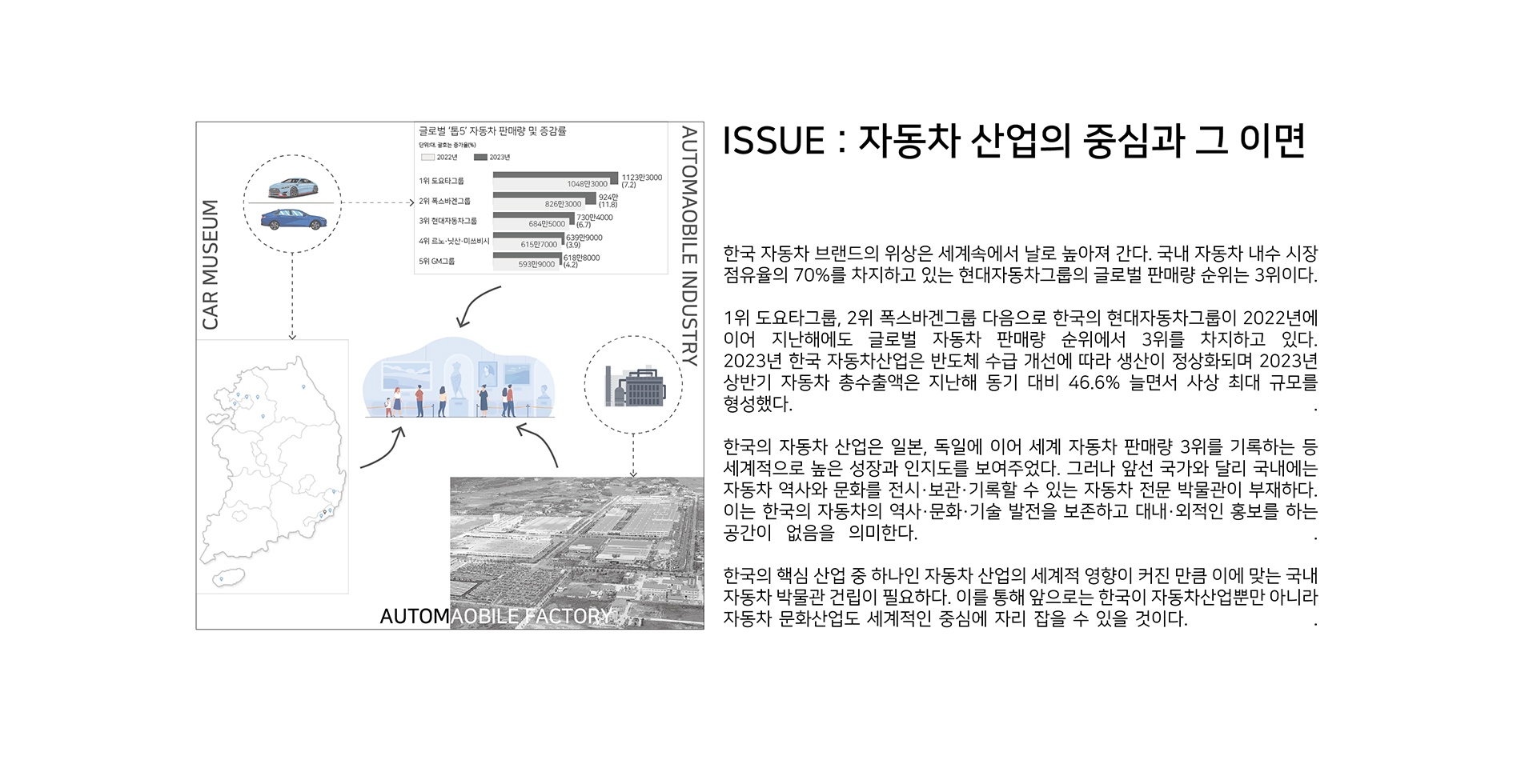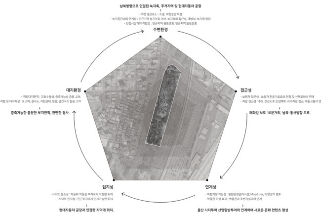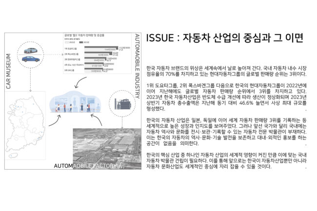 현대자동차 울산공장의 명촌정문과 인접한 곳에 위치한 사이트는 자동차 박물관 건립을 위한 넓은 부지이다. 대한민국 자동차산업의 핵심 도시인 울산에 위치한 사이트는 자동차 박물관을 건립하기 위한 유리한 조건을 갖추고 있다. 자동차산업의 도시에서 자동차 문화산업의 도시로 변화하기 위해 자동차 박물관의 건립이 필요하며, 울산 지역과 연계한 프로그램을 통해 지역경제 활성화에도 긍정적인 효과를 가져올 수 있다.