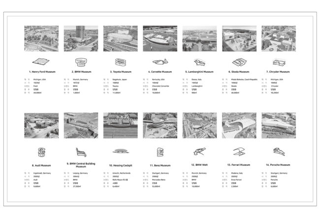 전 세계의 대표적인 자동차 박물관 14개의 공간구성에 대해 분석한 논문을 조사해 보았다. 결론적으로 시간의 흐름에 따라 자동차 박물관의 공간틀, 공간 오브제와 관람 동선이 복합적이고 자유롭게 변하고 있음을 알 수 있었다.