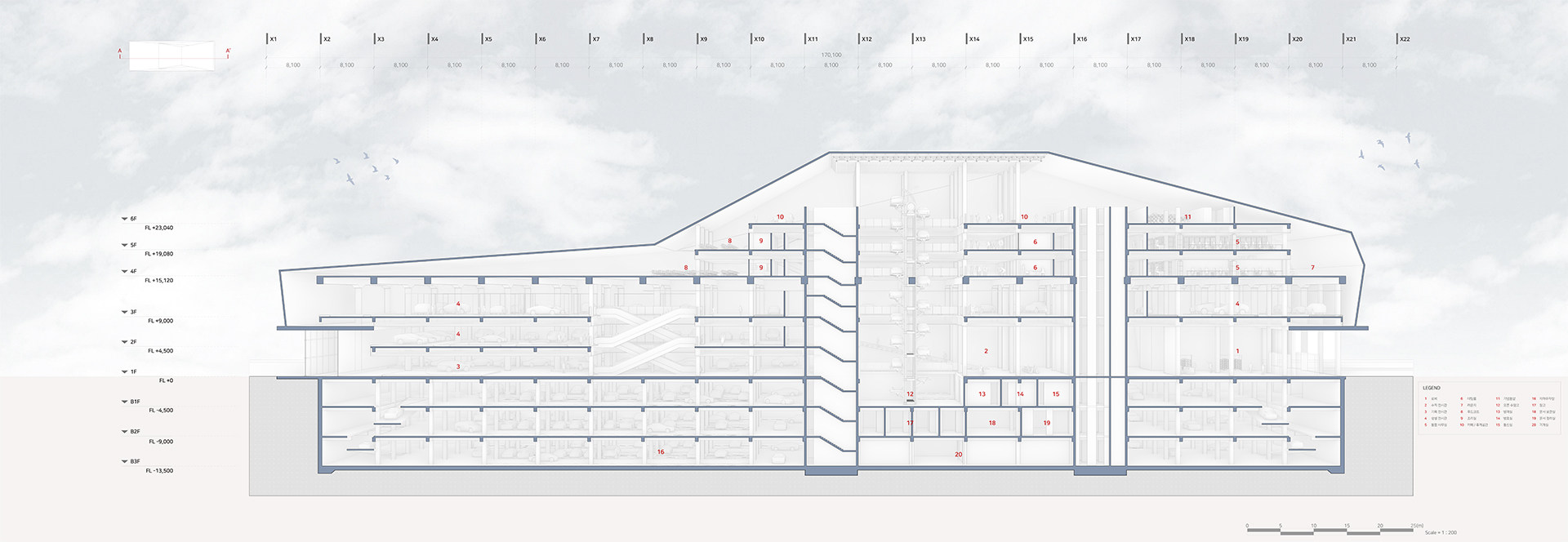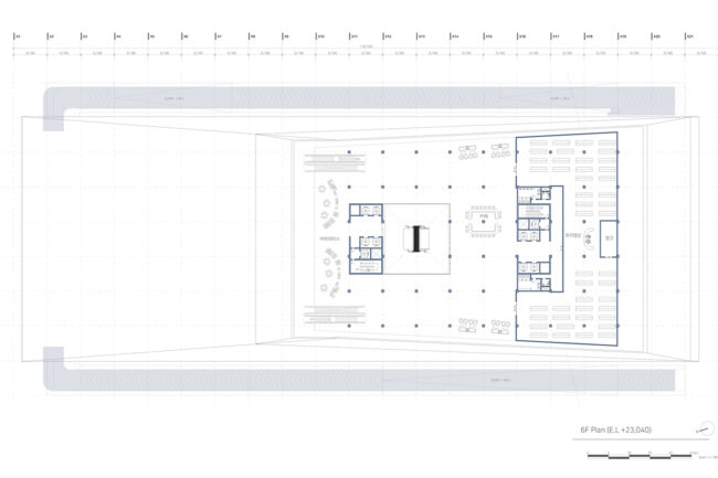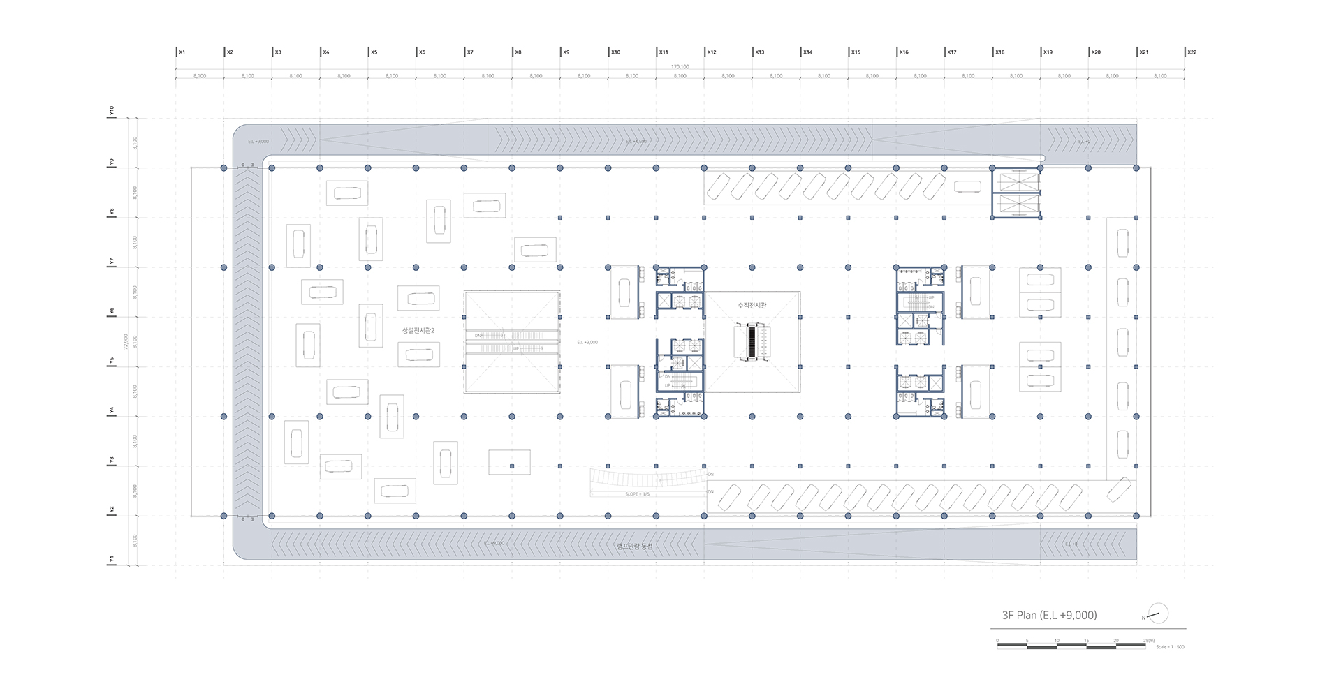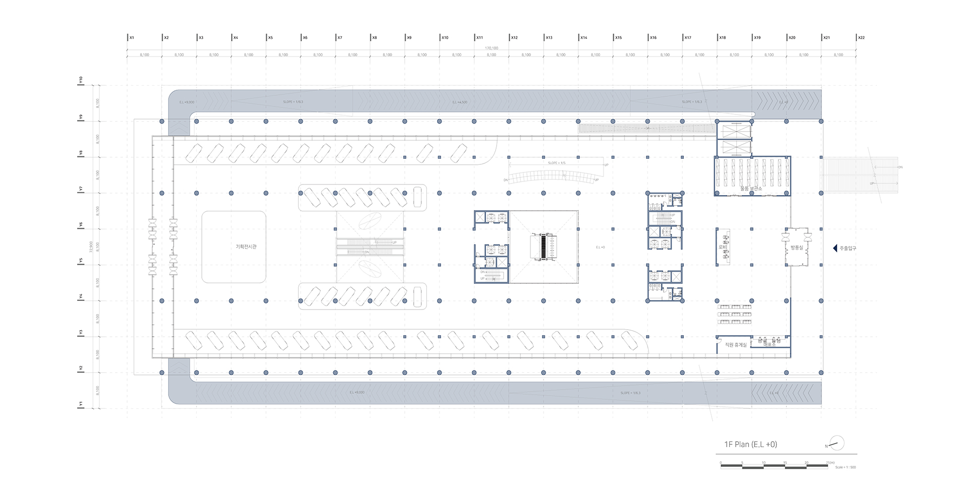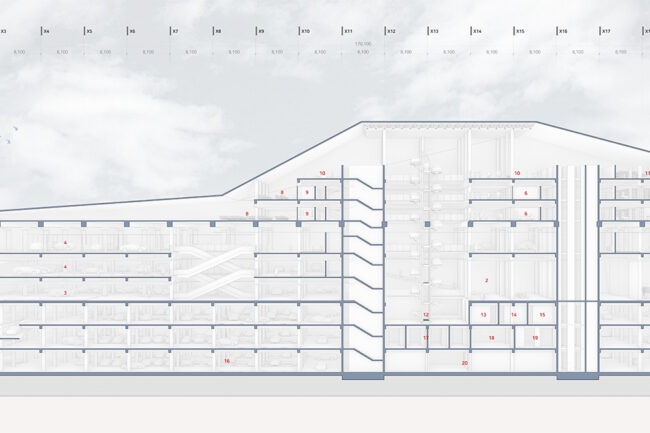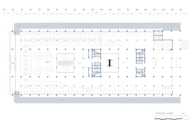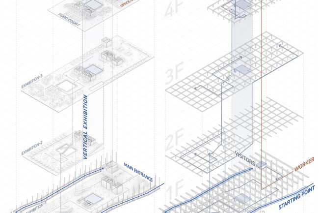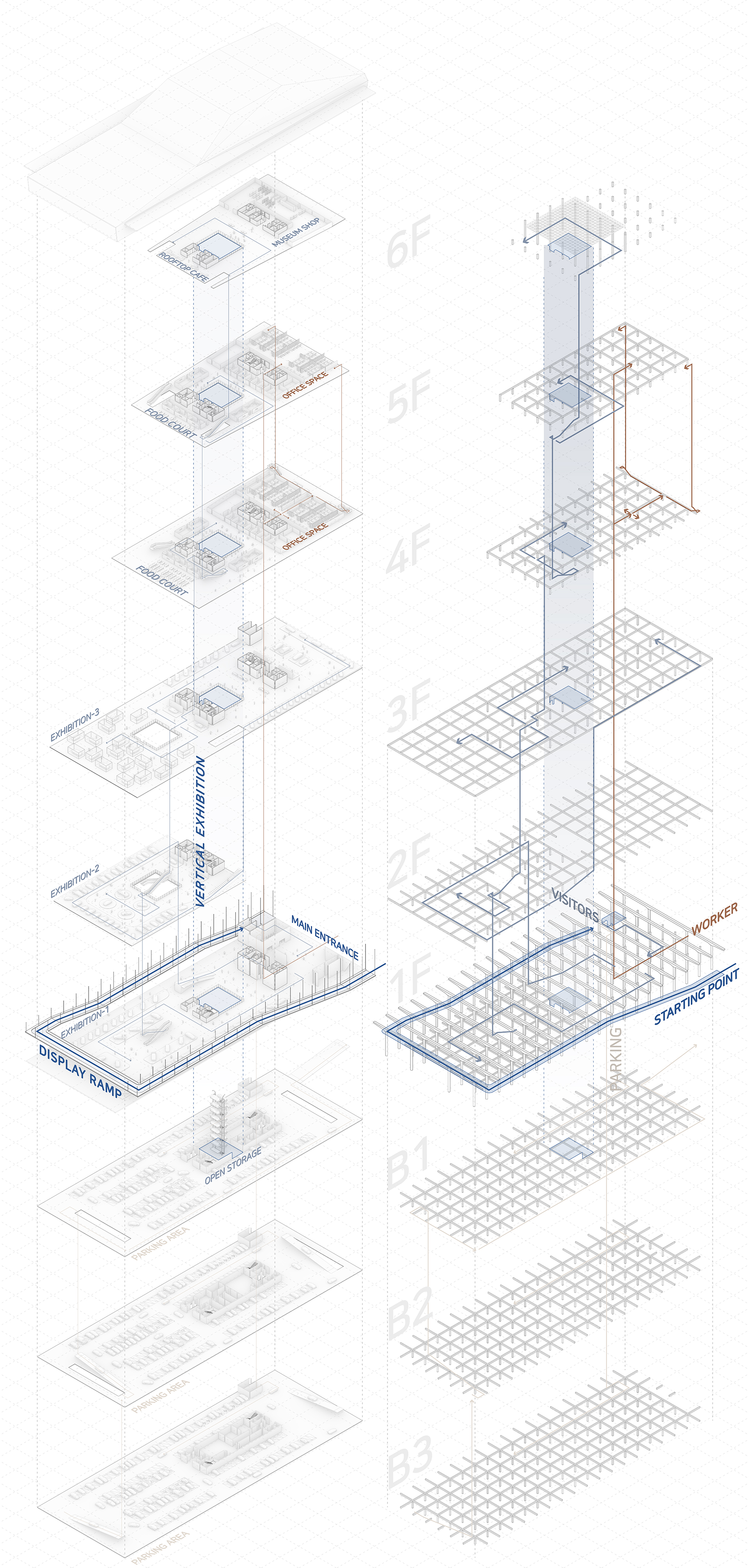 새로운 수직 전시장과 램프 전시공간을 보여준다. 또한 관람자의 동선과 일하는 사람의 동선 구분을 보여주는 다이어그램이다.