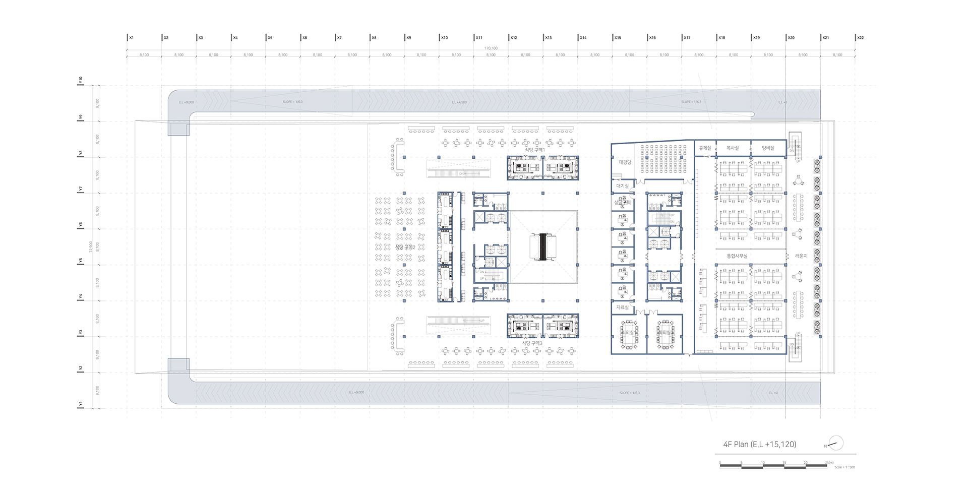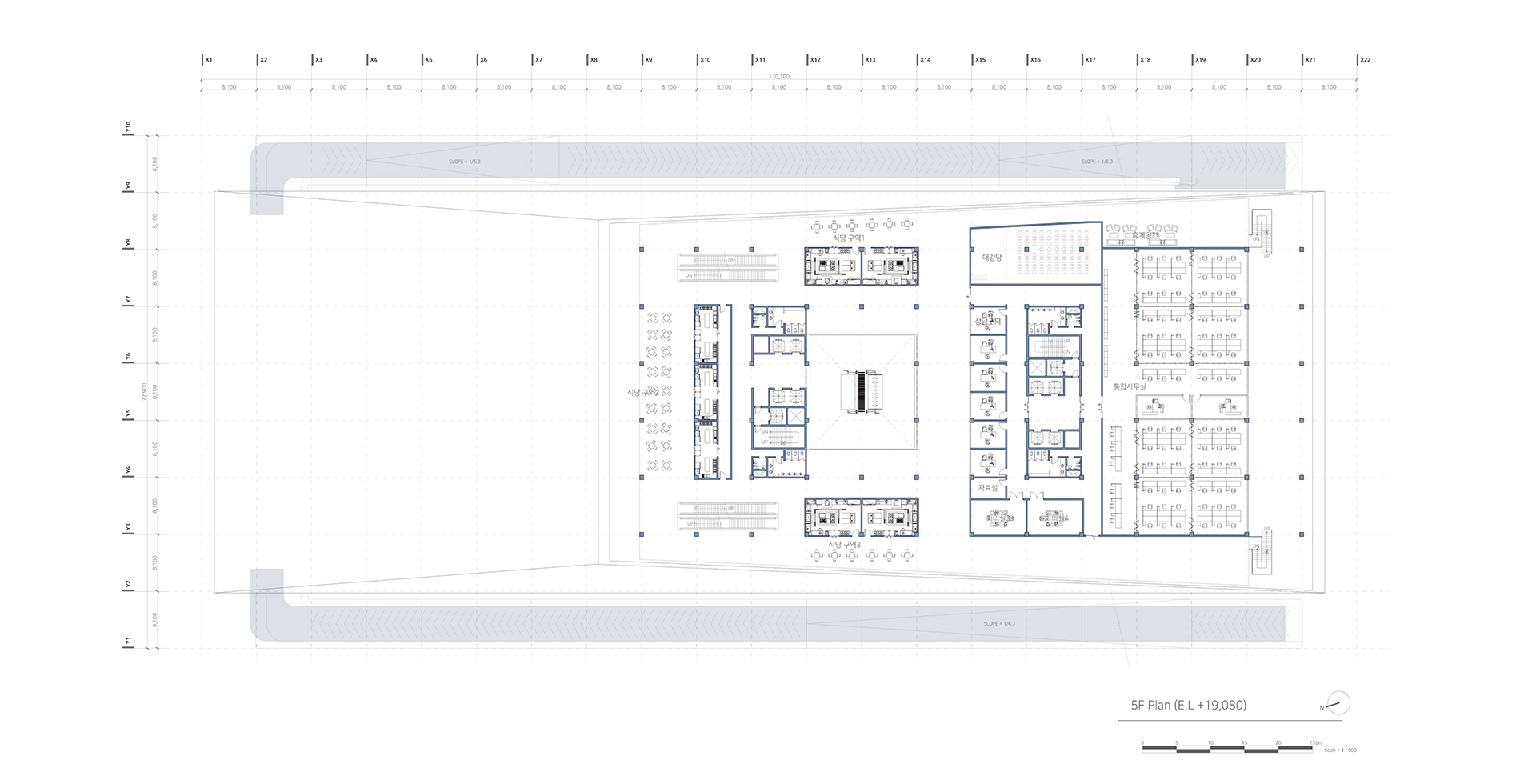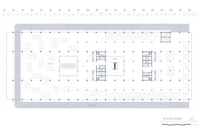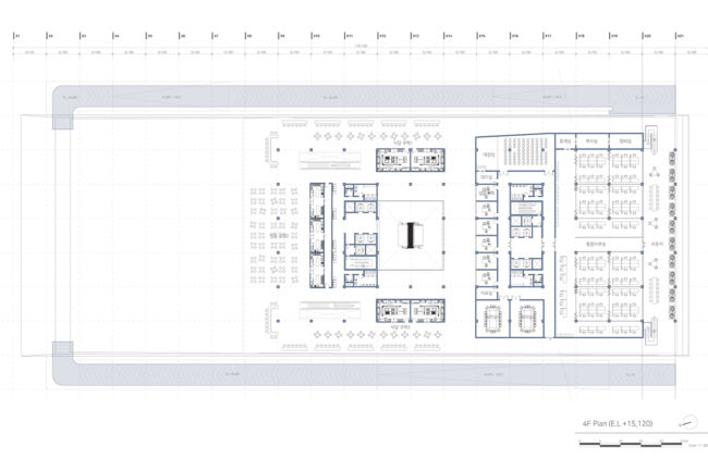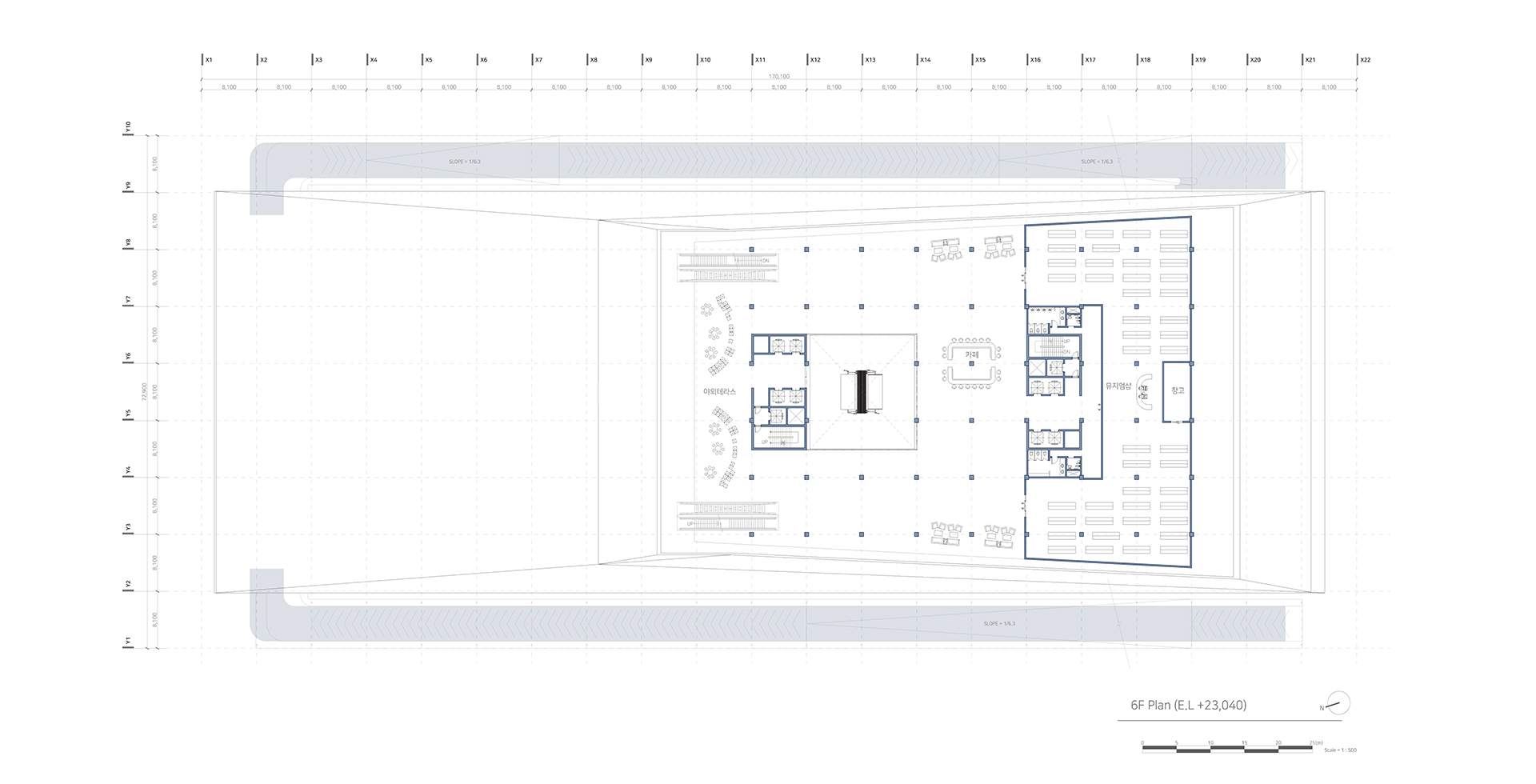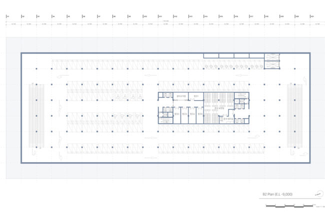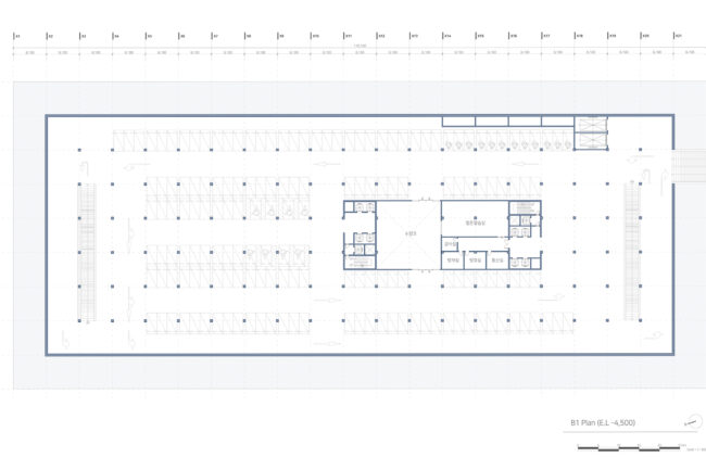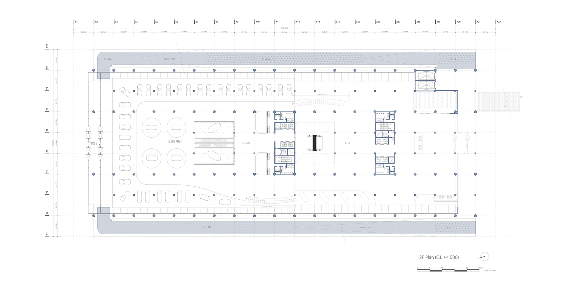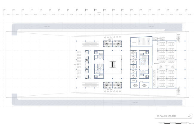 새로운 수직 전시장과 램프 전시공간을 보여준다. 또한 관람자의 동선과 일하는 사람의 동선 구분을 보여주는 다이어그램이다.