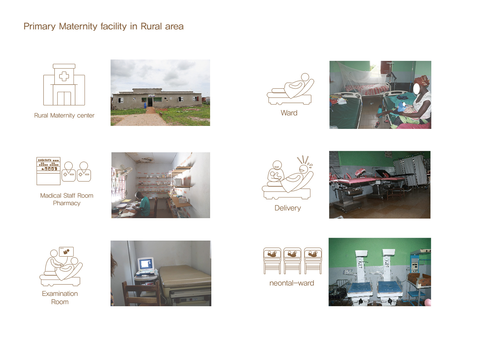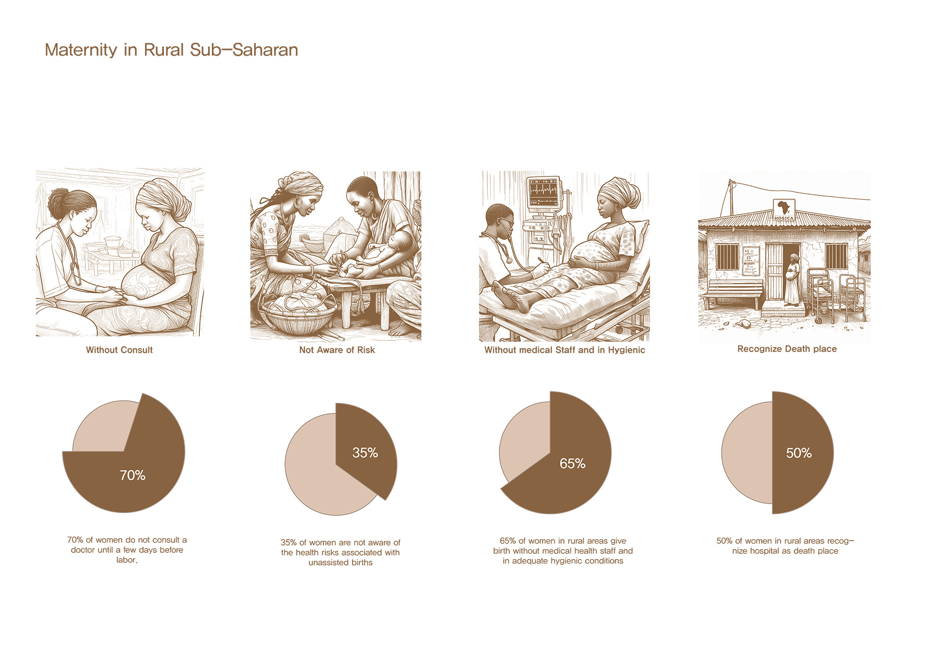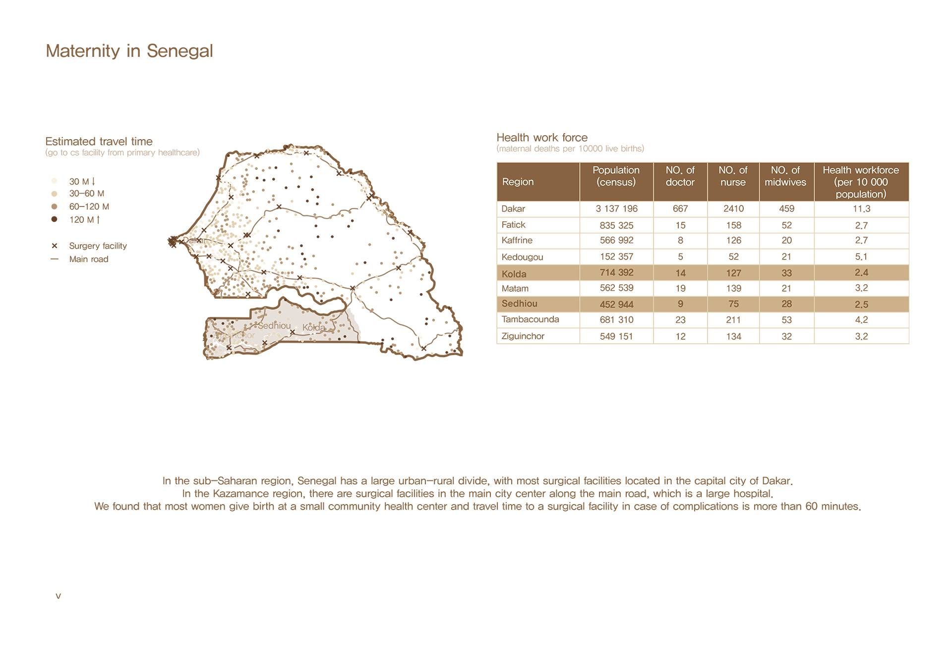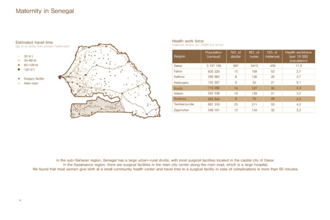 사하라 이남 아프리카의 시골 지역에서는 전 세계 산모 사망의 66%가 발생하고 있습니다. 주요 원인은 제왕절개 수술이 가능한 시설의 부족과 병원을 죽음의 공간으로 인식해 전문가의 도움을 받지 않는다는 점입니다. 특히 세네갈의 카자망스 지역에서는 1차 보건소 수준의 분만 시설은 존재하지만, 수술이 가능한 시설은 주요 도로를 따라 도시 지역에만 분포해 있습니다. 이로 인해 카자망스의 시골 지역에서는 최소 60분, 많게는 120분 이상 걸려 골든타임을 놓치는 일이 빈번합니다. 이에 따라 1차 보건소 수준에서 수술이 가능하고 정상적인 분만 과정을 진행할 수 있으며, 병원을 더 이상 죽음의 공간이 아닌 편안한 공간으로 인식할 수 있는 병원을 설립하고자 합니다.