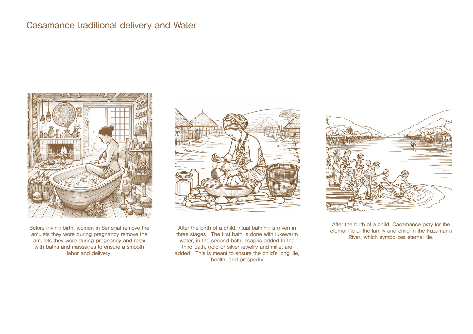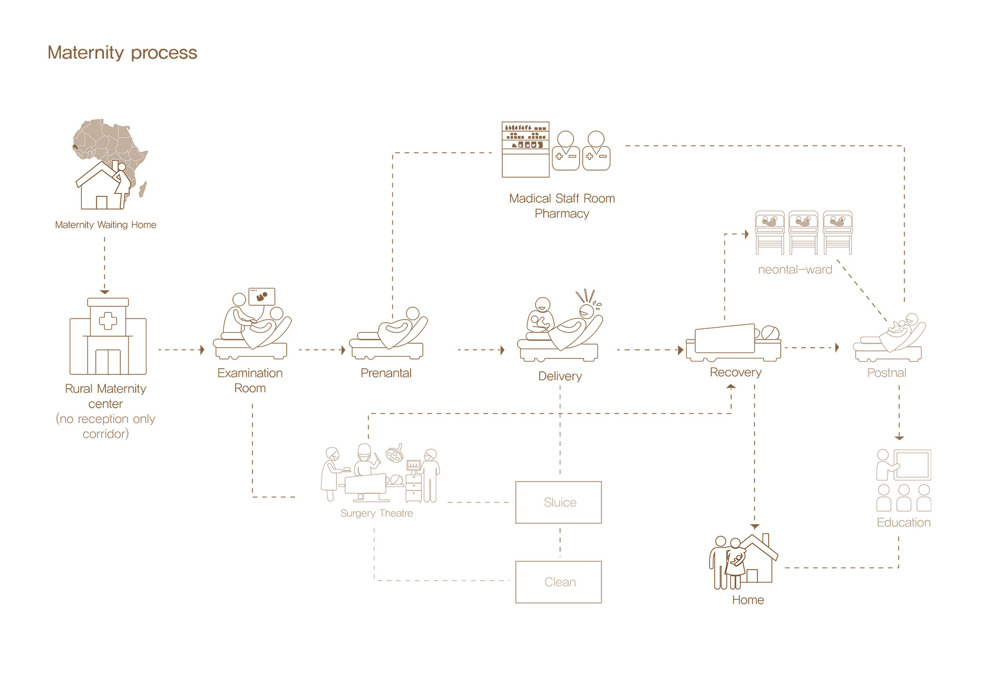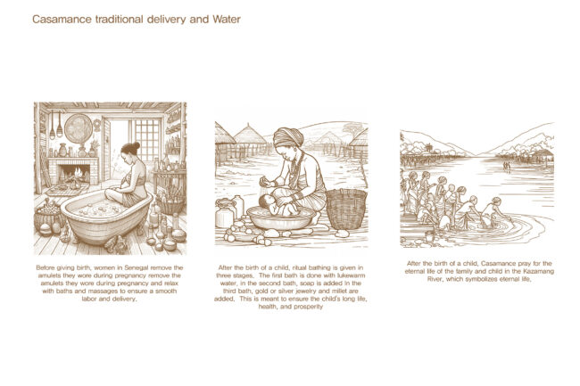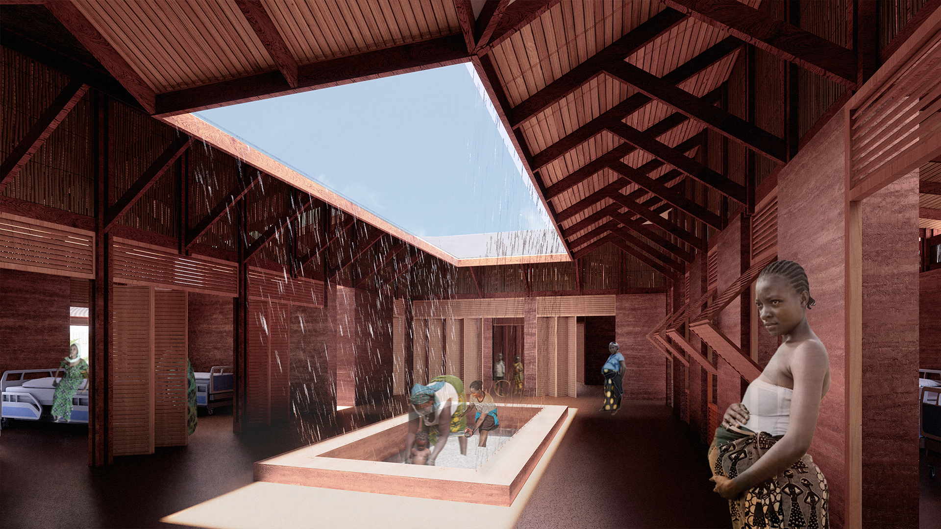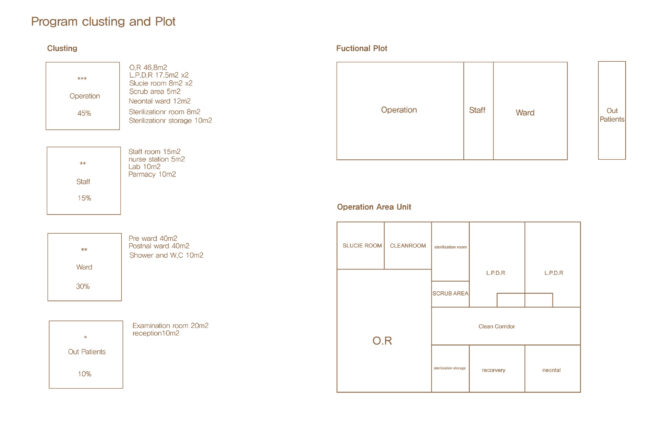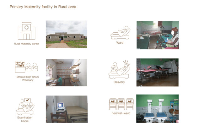 정상적인 분만 과정을 진행하면서도 병원을 ‘죽음의 공간’이 아닌 편안한 공간으로 인식할 수 있도록 하기 위해, 전통 출산과 1차 보건소, 그리고 전문 병원의 프로세스를 연구했습니다. 이를 통해 정상적인 분만 과정과 물과 관련된 전통 의식 프로그램이 많다는 것을 알게 되었고, 이러한 프로그램을 배치하고 기능적으로 구성했습니다.