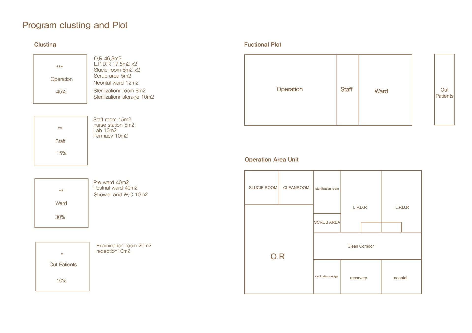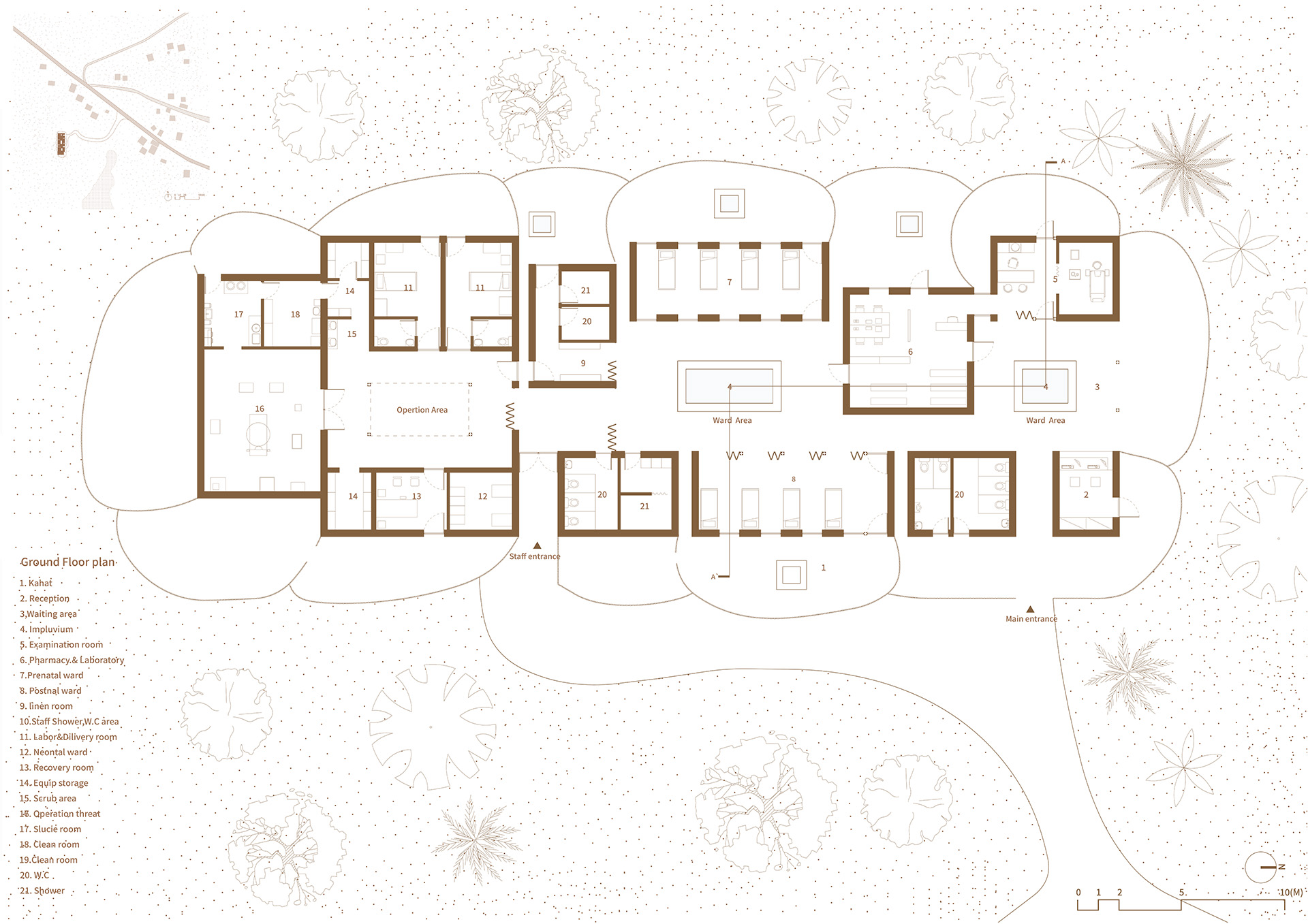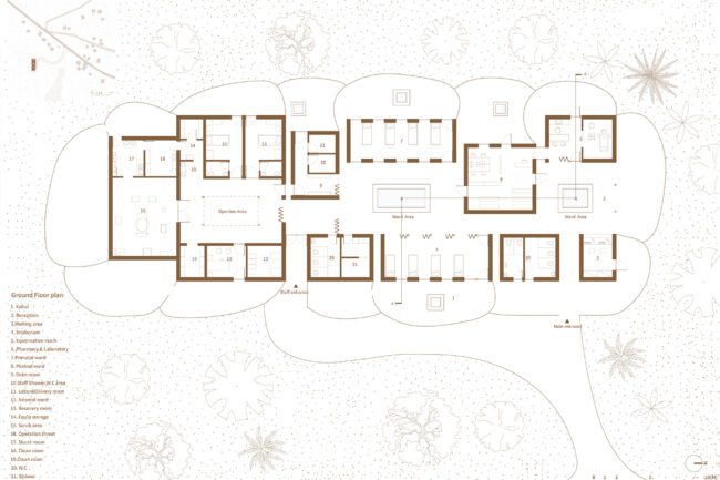 병원은 외래, 병동, 수술 구역으로 나뉘며, 각 구역으로의 명확한 동선이 입구부터 연결됩니다. 외래와 병동 구역에는 신생아의 의식적인 목욕을 위해 그리고 자연적으로 빗물을 모으기 위해 임플루비움을 포함시켰습니다. 각 개별 방에는 사용자가 개인적인 야외 공간을 즐기거나 필요한 야외 프로그램에 참여할 수 있는 “Kahat” 공간이 포함되어 있어 전통 가옥 구조를 유지합니다.