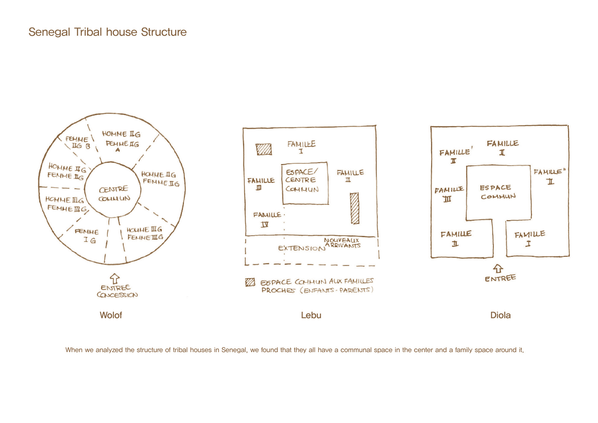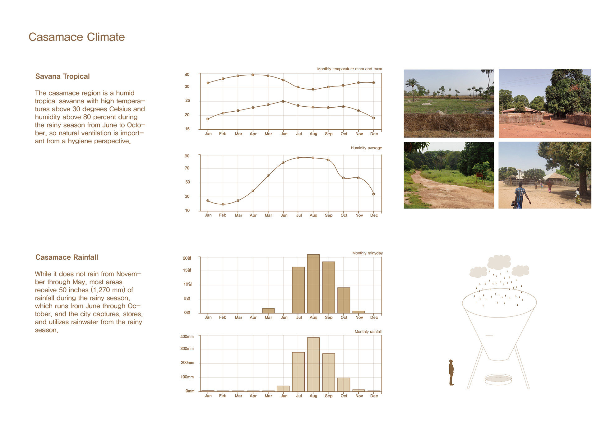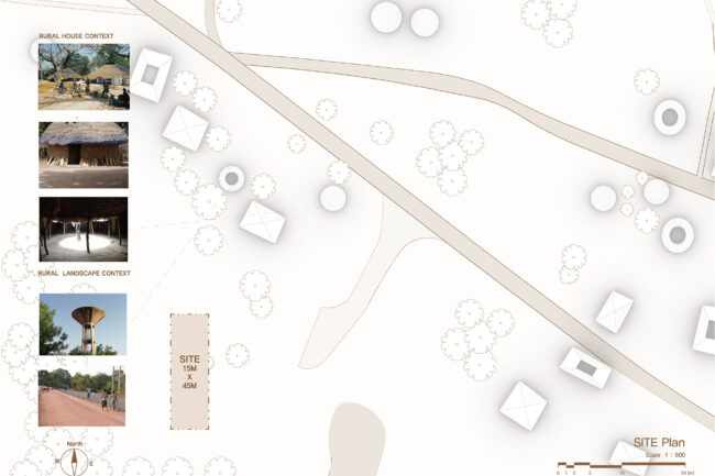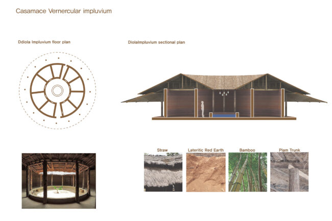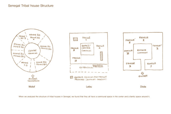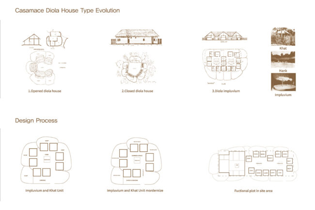 병원을 편안한 공간으로 만들기 위해 집과 같은 분위기로 조성하고자 했으며, 이 지역의 주요 부족인 디올라 부족의 주거 형태를 연구했습니다. 그 결과, 입구 역할을 하며 Common Space 로 사용되는 Hank와, hank를 둘러 싸고있는 각각의 객체의 실이 따로 존재하며 각각의 실로 들어가면 뒷쪽에 담으로 둘러싸인 Kahat이라는 Private Space가 있는 구조가 주거의 타입이 발전하면서도 여전히 존재한다는 것을 알게 되었습니다. 또한, Hank가 Casmace 열대 기후의 비가내리는 우기에 빗물을 모으는 공간으로 발전하여 임플루비움 형태로 변형된 것을 알 수 있었습니다.