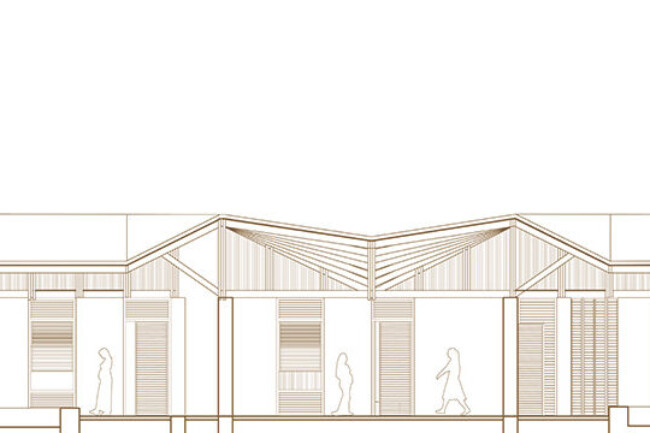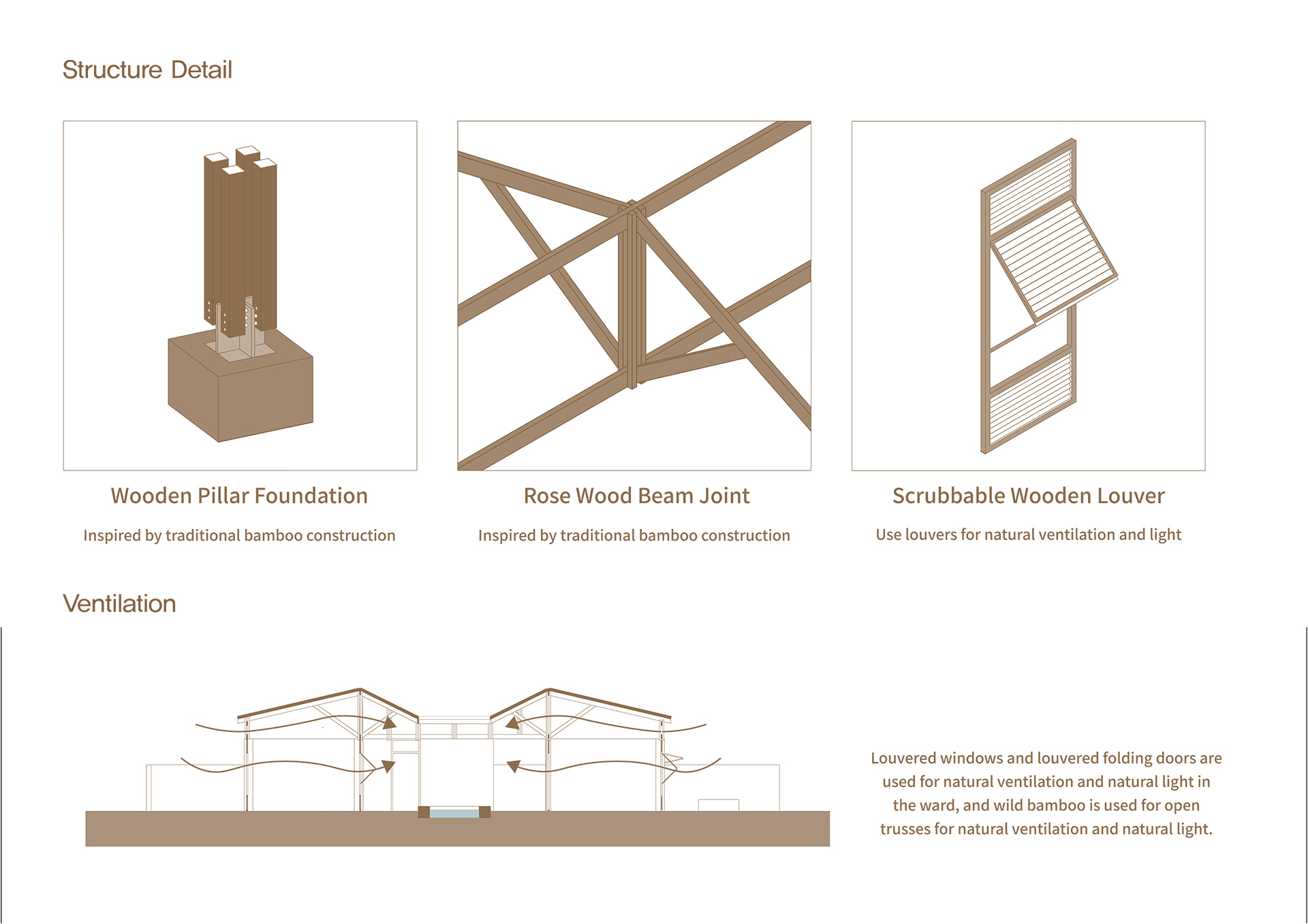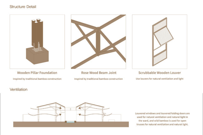 또한 병동 구역에서는 산전 관리에 더 많은 프라이버시가 필요한 공간에 스크럽 루버 창문을 사용하고, 덜 필요한 공간에는 루버 접이식 파티션을 사용하여 자연 환기와 임플루비움 접근을 용이하게 합니다. 이 디자인은 전통적인 구조를 느낄 수 있도록 하면서도 프라이버시와 기능성을 보장합니다.