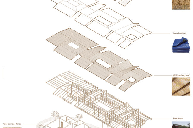 지붕 지지 구조는 전통적인 대나무 직조 방법에서 영감을 받았습니다. 네 개의 50x50mm 로즈우드 기둥이 주요 수직 지지대로 세워졌습니다. 이들 사이에는 여러 개의 150mm x 50mm 로즈우드 기둥이 네 방향에서 구조를 연결하여 견고한 지지 구조를 형성했습니다. 이 디자인은 강도를 제공할 뿐만 아니라 전통 건축에서 중요한 환경적 스트레스를 견디기 위한 유연성을 허용했습니다.