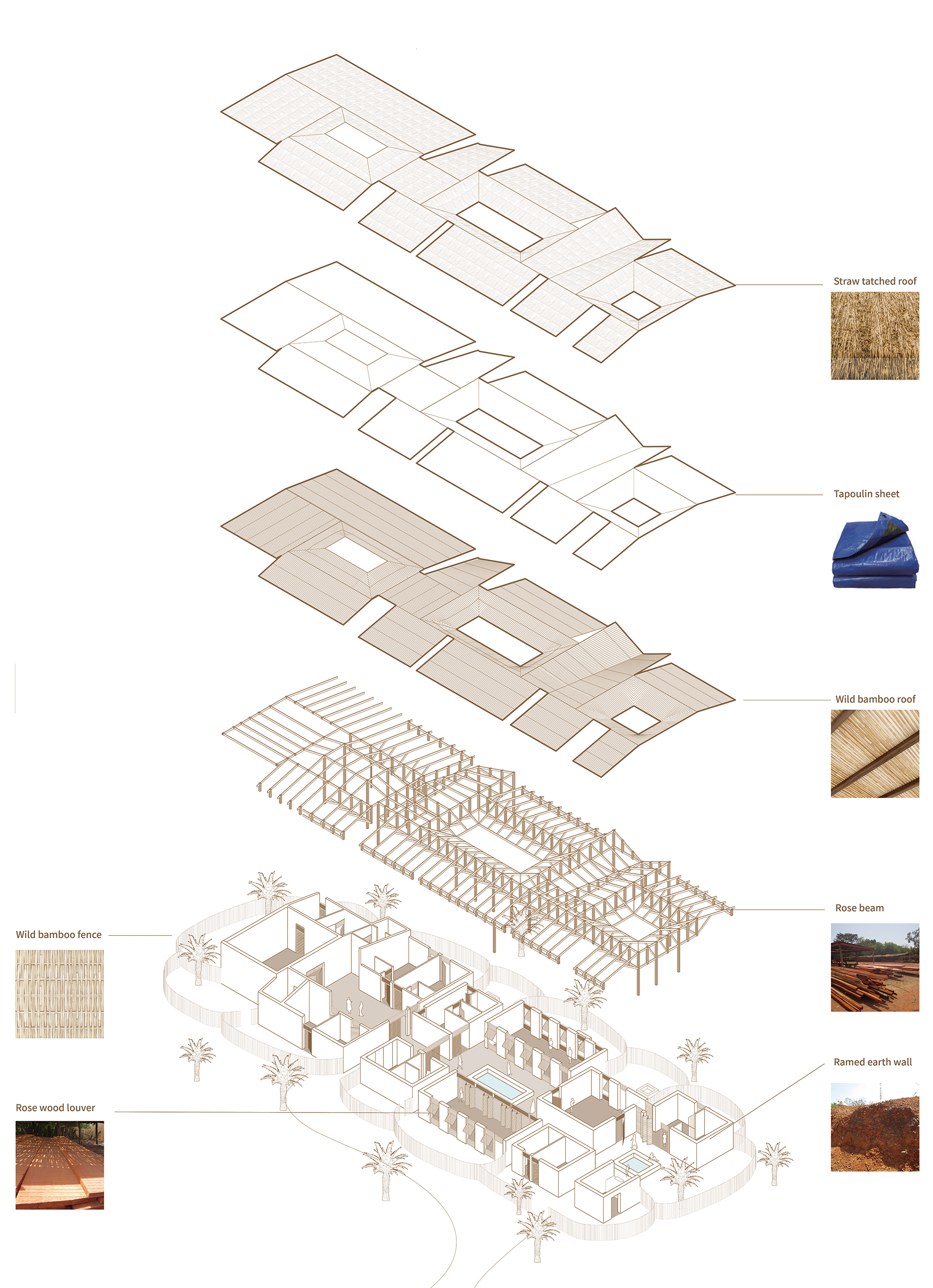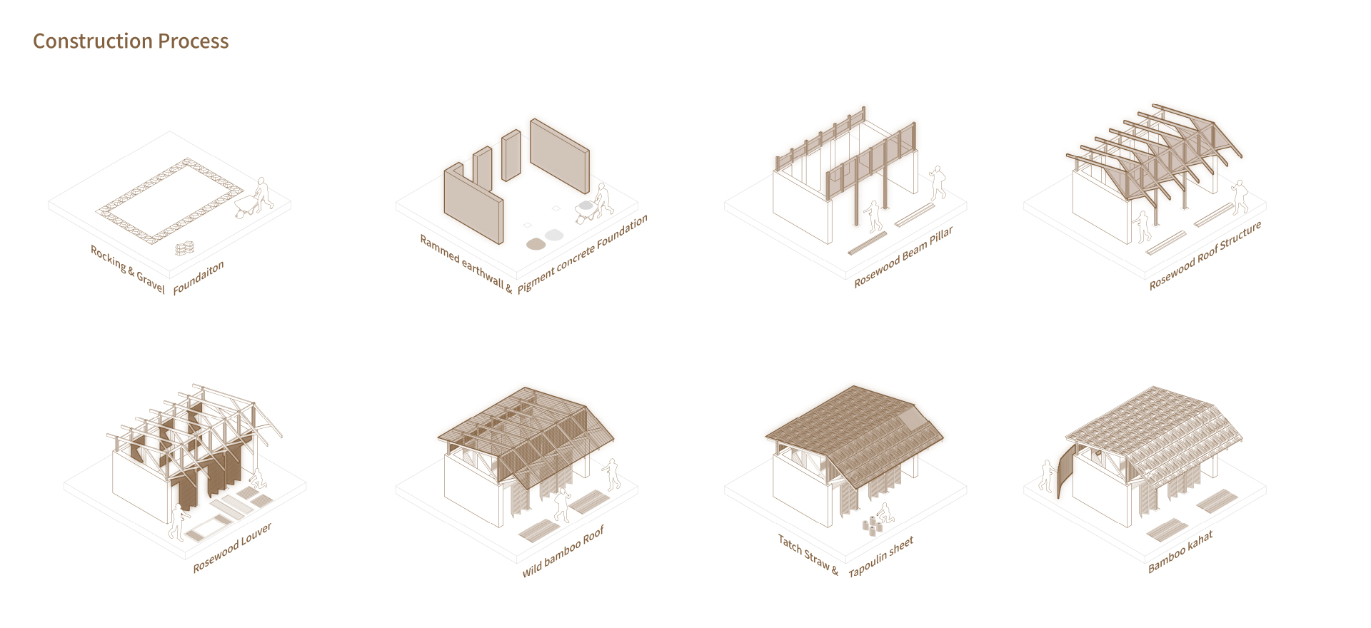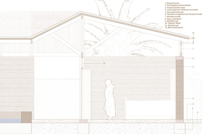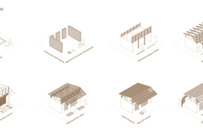 대부분의 건축 공정은 세네갈의 전통 가옥이나 전통 건축의 공정에서 영감을 받았습니다. 우선 돌과 자갈을 사용하여 기초를 만들었습니다. 벽은 흙을 다져서 흙다짐 벽을 형성하였고, 벽이 없는 구역에는 로즈우드 기둥과 겹합하기 위해서 색료 콘크리트로 만들었습니다. 지붕 지지 구조는 전통 가옥의 대나무를 tied 하는 방식에서 영감을 받았습니다. 네 개의 50x50mm 로즈우드 기둥을 세우고, 여러 개의 150mm x 50mm 로즈우드 기둥이 네 방향에서 연결되어 지붕 지지 구조를 형성했습니다. 지붕 자체는 전통 가옥을 연상시키는 야생 대나무와 짚을 조합하여 건설되었습니다.