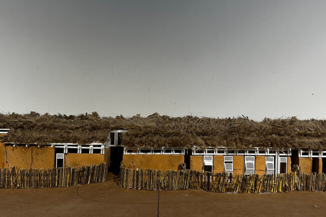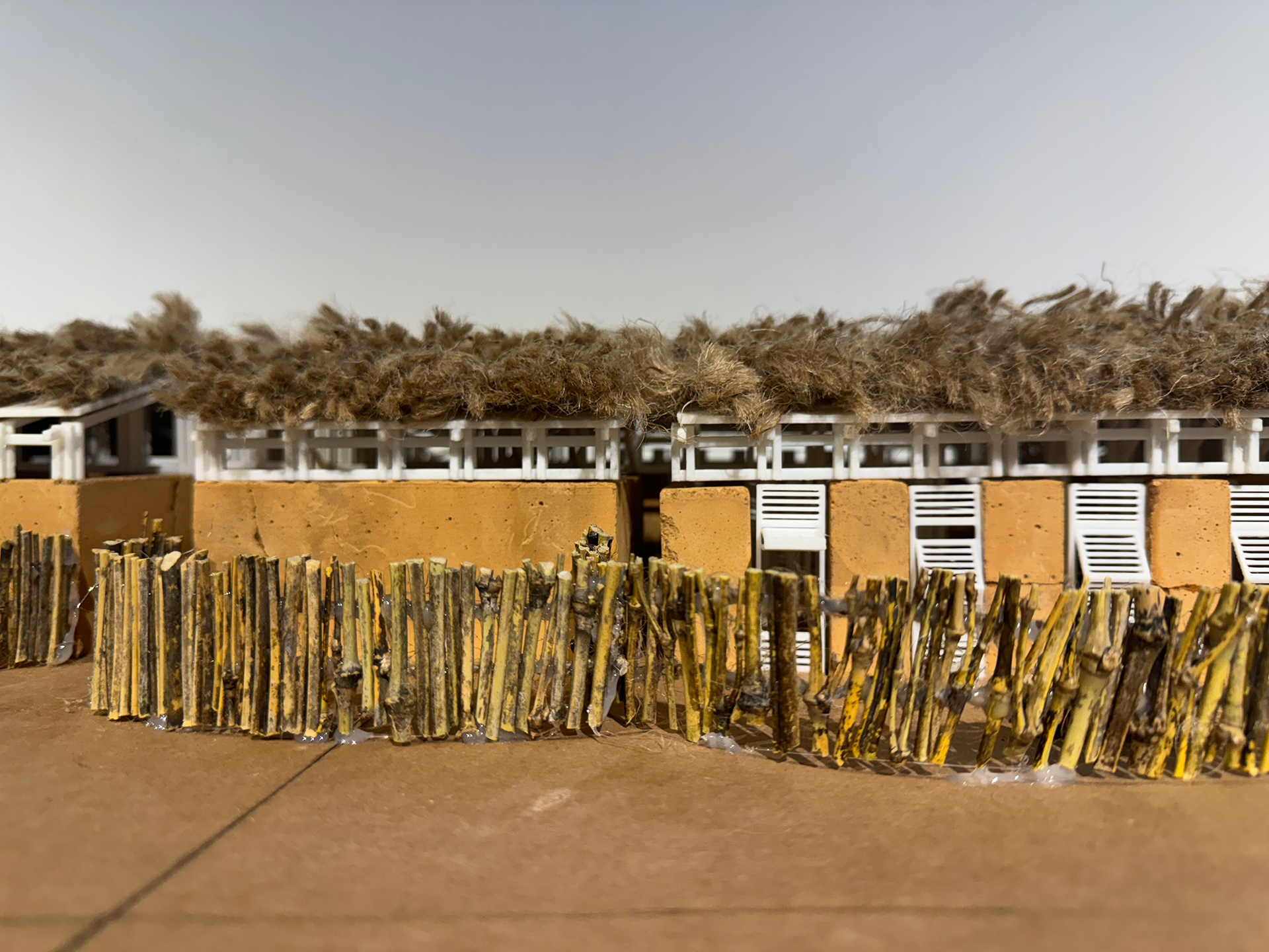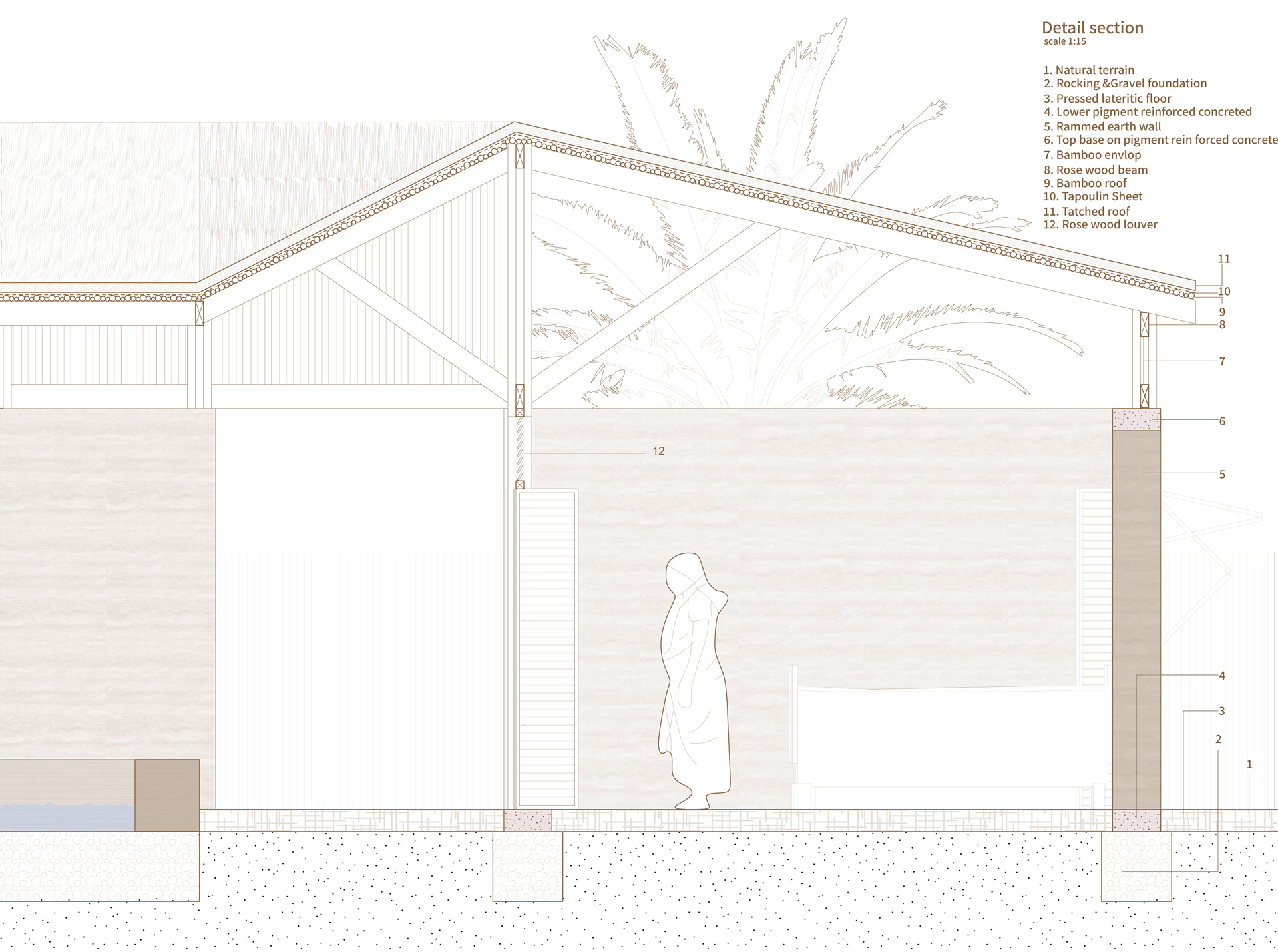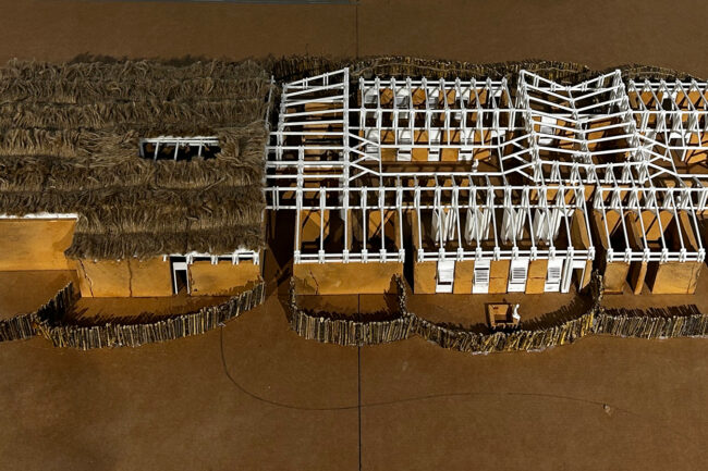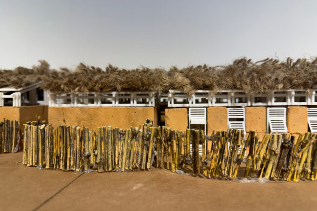 대부분의 건축 공정은 세네갈의 전통 가옥이나 전통 건축의 공정에서 영감을 받았습니다. 우선 돌과 자갈을 사용하여 기초를 만들었습니다. 벽은 흙을 다져서 흙다짐 벽을 형성하였고, 벽이 없는 구역에는 로즈우드 기둥과 겹합하기 위해서 색료 콘크리트로 만들었습니다. 지붕 지지 구조는 전통 가옥의 대나무를 tied 하는 방식에서 영감을 받았습니다. 네 개의 50x50mm 로즈우드 기둥을 세우고, 여러 개의 150mm x 50mm 로즈우드 기둥이 네 방향에서 연결되어 지붕 지지 구조를 형성했습니다. 지붕 자체는 전통 가옥을 연상시키는 야생 대나무와 짚을 조합하여 건설되었습니다.