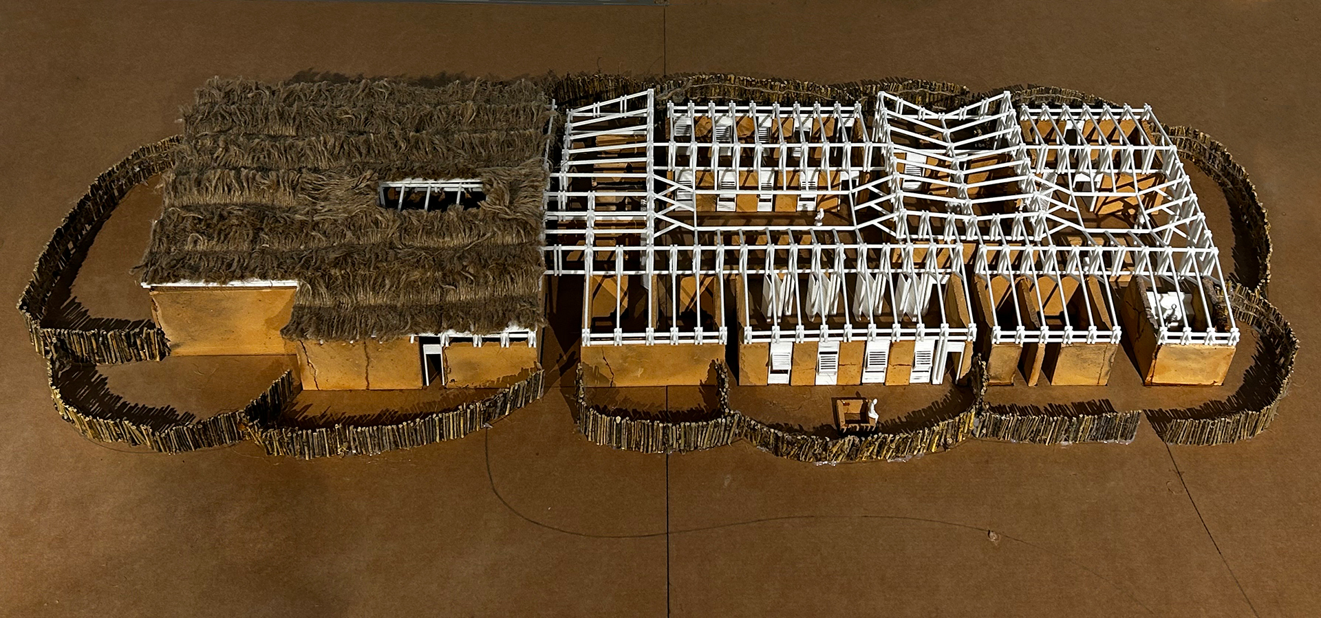 좀 더 자세히 설명하자면, 기초는 돌과 자갈을 배열하여 안정적인 기반을 조성하는 것으로 시작되었습니다. 다음으로 벽은 흙을 다져서 건설했으며, 이 기술은 구조적 통합성뿐만 아니라 열 차단 기능도 제공했습니다. 벽이 필요 없는 구역, 예를 들어 개방된 공간이나 큰 복도에서는 로즈우드 기둥을 위한 기초를 색료 콘크리트를 사용하여 만들었습니다. 이 방법은 기둥을 위한 견고하고 내구성이 있는 기초를 보장했습니다.
