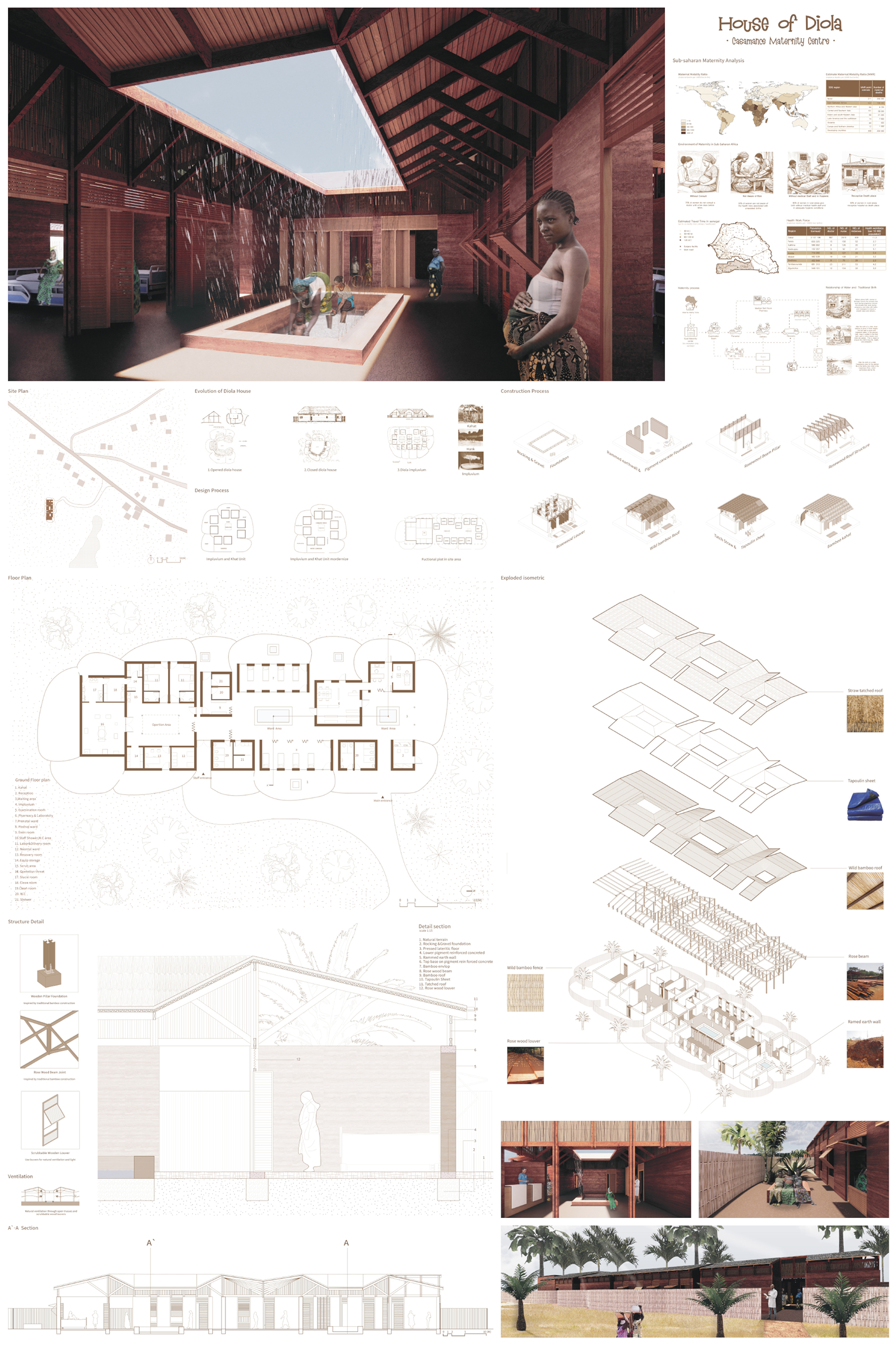 그래서, 디올라 부족의 전통 가옥에서 찾은 Hank, Kahat, 임플루비움과 현대적인 병원의 기능적 배치를 결합하여 정상적인 분만 과정을 진행할 수 있고, 병원을 ‘죽음의 공간’이 아닌 편안한 공간으로 인식할 수 있는 병원을 만들고자 하였습니다.