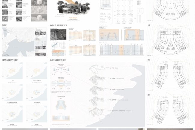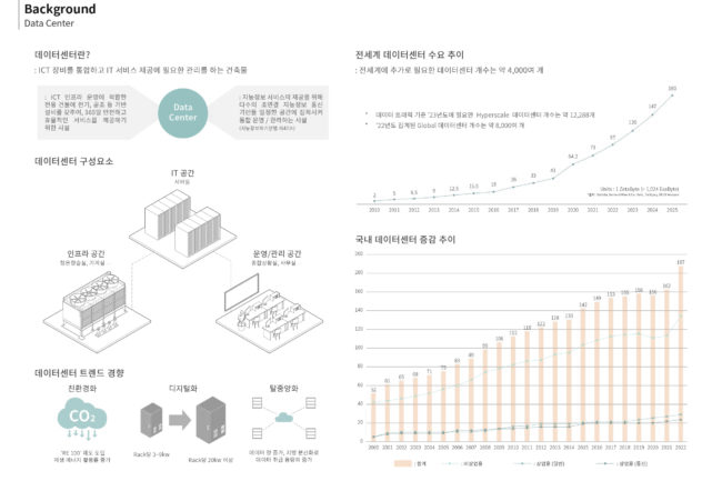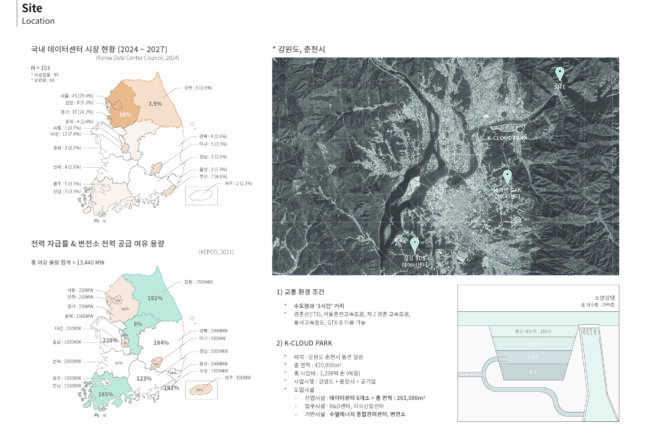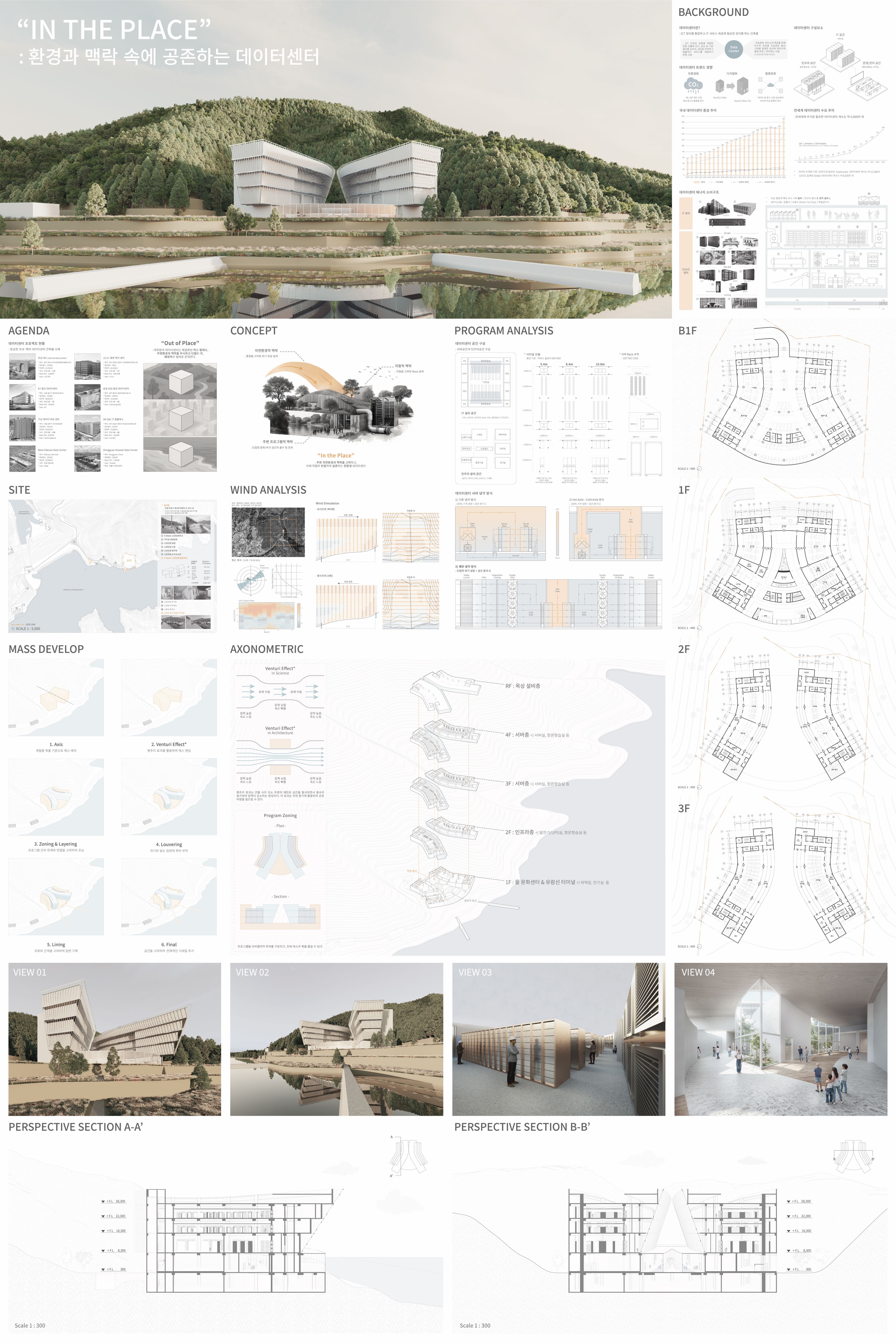본 작품 [”In The Place” : 환경과 맥락 속에 공존하는 데이터센터] 는 기능적이고 폐쇄적인 건축 유형을 새로운 시각으로 재해석하는 데에서부터 출발한다. 기존 데이터센터의 획일적이고 폐쇄적인 형태에서 벗어나, 자연환경과 맥락을 적극적으로 수용하며 지역과 소통하는 새로운 형태의 데이터센터를 제안하는 프로젝트이다.