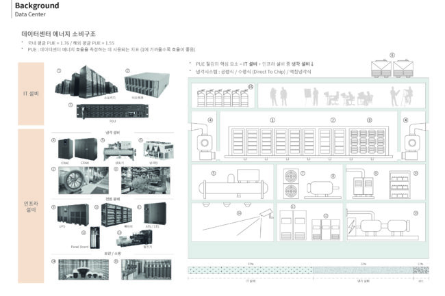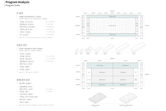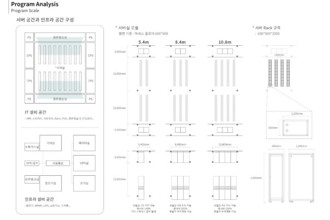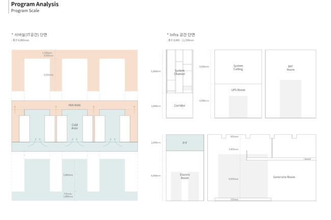 프로젝트 초기에는 데이터센터의 기본 구성과 에너지 소비구조, 서버 냉각 방식 등에 대한 심층 분석을 진행하였다. 데이터센터의 공간은 크게 IT 공간, 인프라 공간, 운영관리 공간으로 나눌 수 있으며 이들은 동선과 기능에 따라 서로 긴밀히 연결되어 있고, 각 공간에 필요한 주요 실들을 파악하였다.