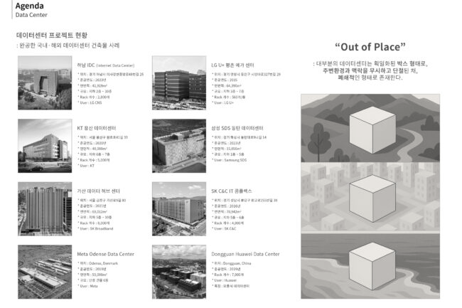 기존의 데이터센터들은 대체로 ‘박스 형태’ 의, 주변 지형과 맥락을 무시한 채 어디에도 속하지 않은, 맥락과 단절된 객체처럼 자리해왔다. 이러한 기존의 문제적 형식을 ‘Out of Place’ 로 정의하고, 이에 대한 대안으로 주변 자연환경과 맥락을 능동적으로 수용하고 통합하는 ‘In the Place’ 라는 개념을 제시하고자 한다.
