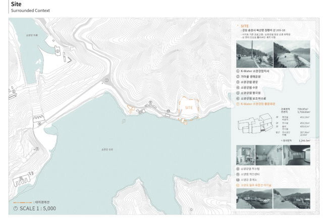 이러한 개념을 구현하기 위해, 프로젝트 부지는 춘천 소양강댐 상류에 위치한 기존 공영 주차장 부지로 선택하였다. 이 부지는 삼면이 산으로 둘러싸인 M자 형태의 지형을 가지고 있으며, 전면에는 소양호와 유람선 터미널이 위치해 있어 독특한 공간적 맥락을 제공한다. 또한, 사이트 주변에는 소양강댐 물문화관이라는 프로그램이 있는데, 이는 노후화된 전시 방식과 공간 구성으로 인해 방문객의 유입과 공간의 활용도가 현저히 저조한 상황이었다.