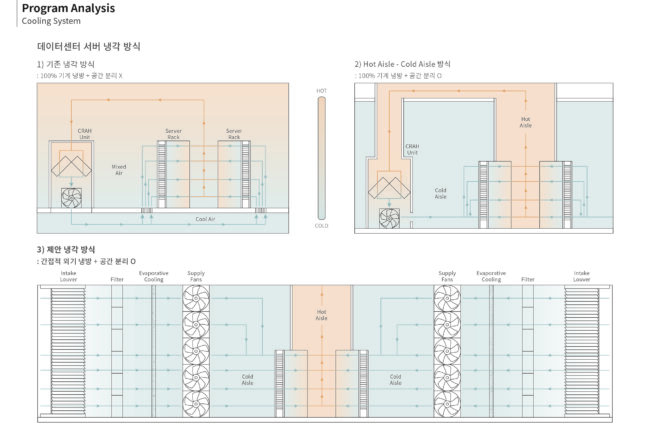 특히, 데이터센터의 에너지 소비 중 약 90%를 IT 설비와 냉각 설비가 차지한다는 것을 알 수 있었고, 이를 바탕으로 기존의 기계 환기에 의존하던 열 대류 방식의 서버 냉각 대신 외부의 바람을 활용하는‘간접외기 냉각 방식’을 제안하여 본 프로젝트에 적용하였다. 이는 외부 바람을 ‘3중 필터’ 를 통해 정제하여 서버실 냉각에 활용하는 방식으로, 에너지 절감과 환경적 지속 가능성을 동시에 도모할 수 있는 친환경 냉각 방식이다.