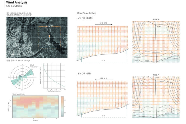 이러한 냉각 방식을 건축적으로 구체화하기 위해 CFD(Computational Fluid Dynamics) 시뮬레이션을 활용하여 부지에 부는 바람의 방향과 세기 등을 분석하였다. 이러한 시뮬레이션 결과를 바탕으로, 해당 부지에 가장 많이 부는 계절풍의 축을 확인하고, 낮과 밤 시간대에 부는 바람이 서로 반대 방향인 점도 함께 파악하였다.