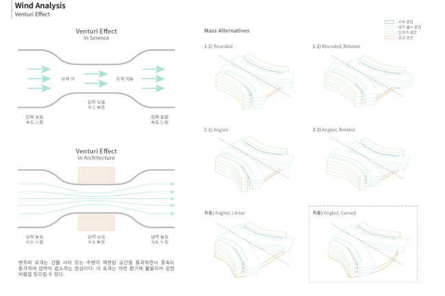 특히, 바람 효과 중 ‘벤추리 효과’ 를 활용하여 건물 사이의 협소한 공간을 통과할 때 풍속이 증가하는 효과를 매스에 적용하여 외부 바람을 더 강력하게 흡입할 수 있도록 설계하였다.