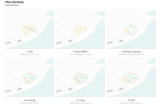 우선 첫 번째로, 바람의 흐름(계절풍 축)을 고려하여 전체 매스의 축을 설정하고, 두 번째로 벤추리 효과를 극대화하기 위해 매스를 곡선 형태로 구부렸다. 세 번째 단계에서는 프로그램 간 위계에 따라 평면 및 단면적인 조닝을 진행하였으며, 마지막으로 외기에 직접 접하는 서버실 공간에 루버 시스템을 적용하여 자연 환기를 유도하고 직사광선을 차단하도록 하였다.