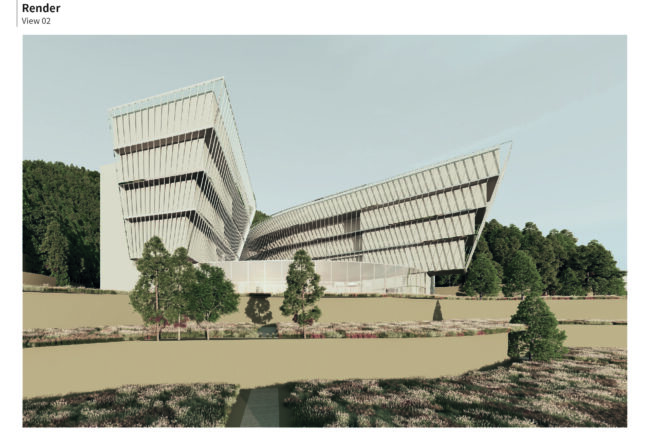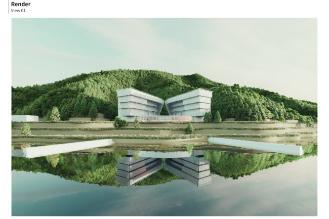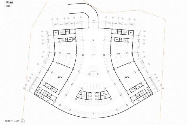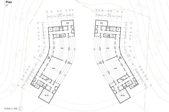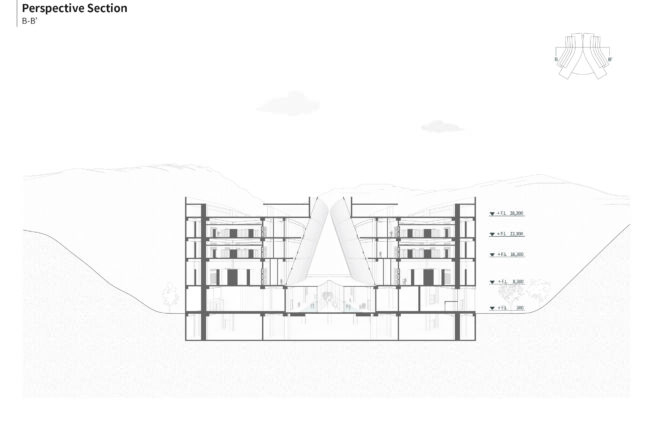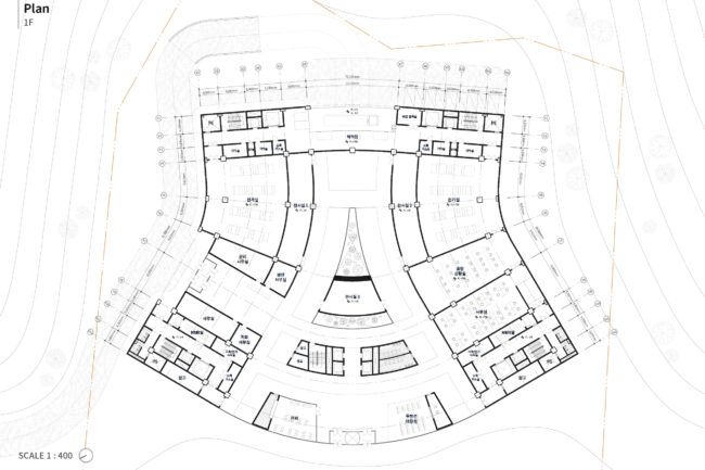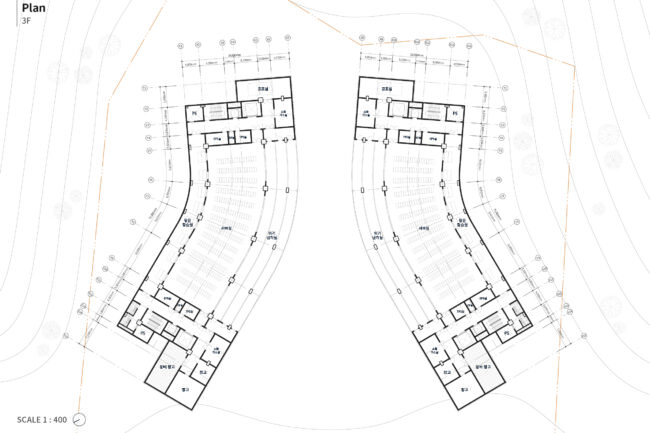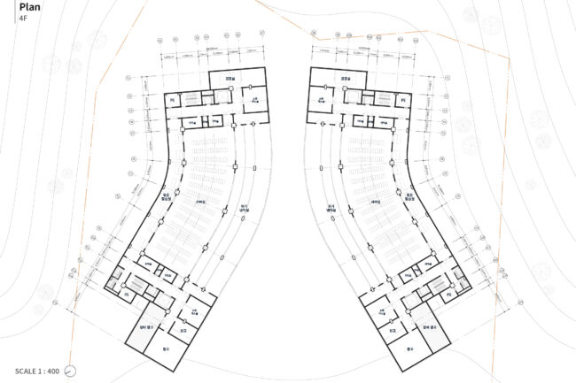 이렇게 형성된 건물은 최종적으로 두 개의 곡선 매스가 마주 보며 배치되고, 그 사이에 형성된 중앙의 풍통로가 자연풍을 내부로 유입시키는 역할을 한다. 저층부에는 공공 프로그램과 운영관리 공간을 배치하여 방문자와 직원의 동선을 명확히 분리하였고, 양쪽의 상부 윙 매스에는 서버실과 인프라 공간을 배치하여 보안성과 운영 효율성을 동시에 확보하였다.