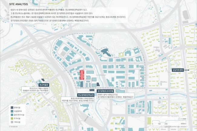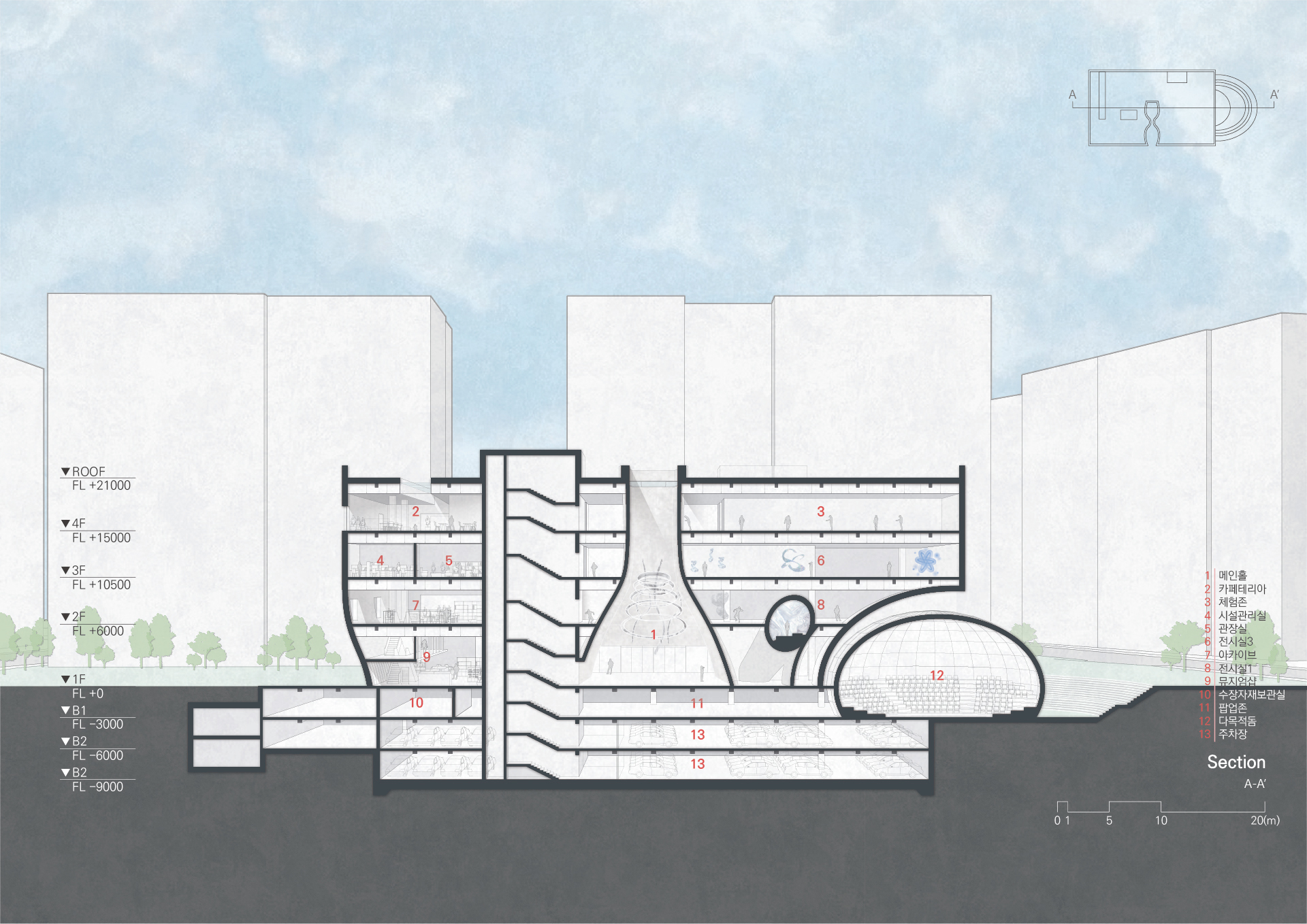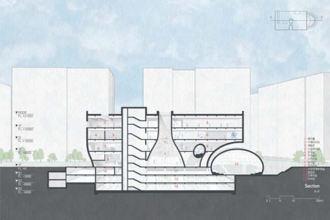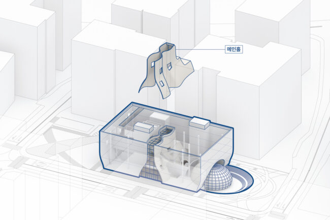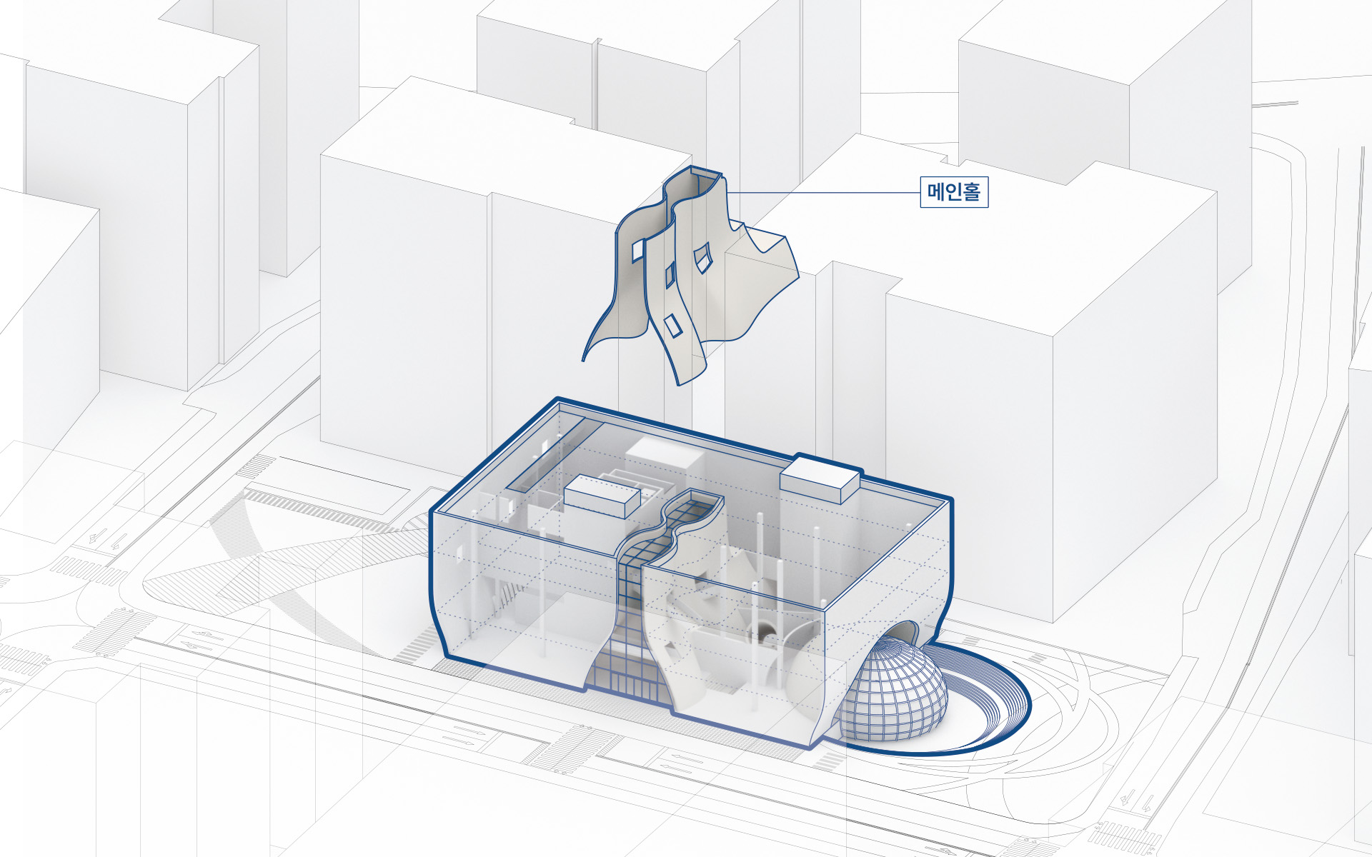 현재 사이트는 콘텐츠 거리라는 축과 중앙에서 만나게 된다. 중앙 공간은 전면이 유리로 이루어진 대공간으로, 건물 내외부에서 전시와 상호작용할 수 있도록 설계되었다. 이 대공간인 메인홀을 기준으로 빛이나 필요공간에 따라 매스가 디자인되었으며, 메인홀은 많은 변화가 일어나는 기획전시 공간으로 곡면으로 이루어진 벽이나 공중에 미디어 전시 및 홀로그램 전시가 가능하게 구성되었다.