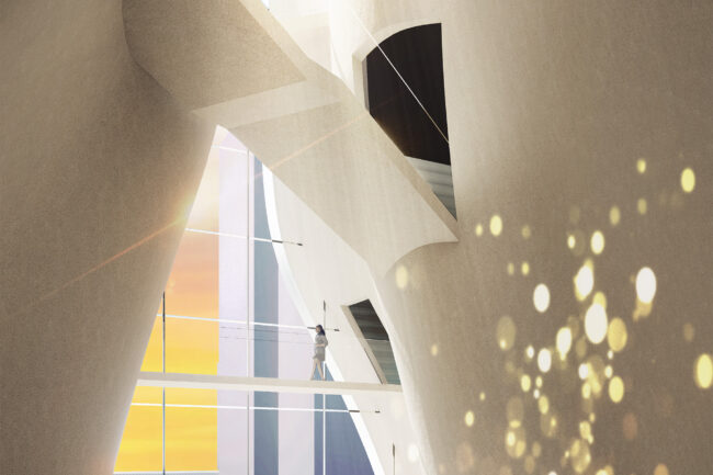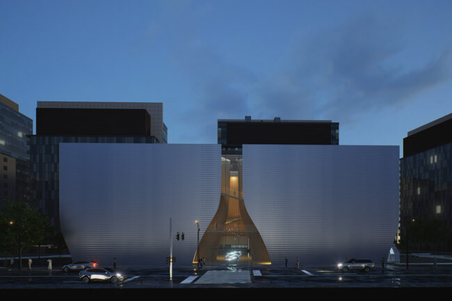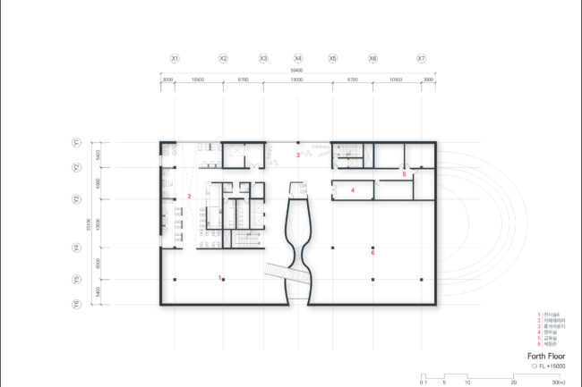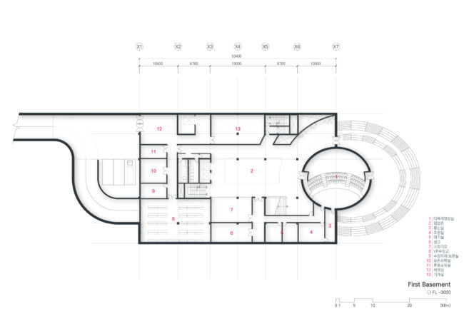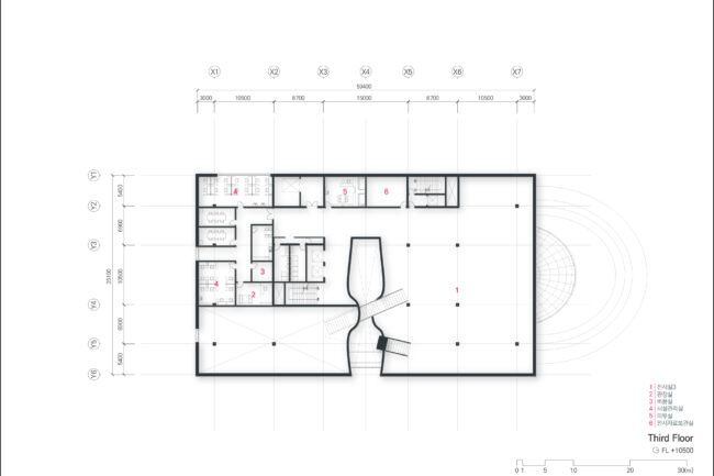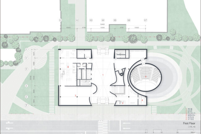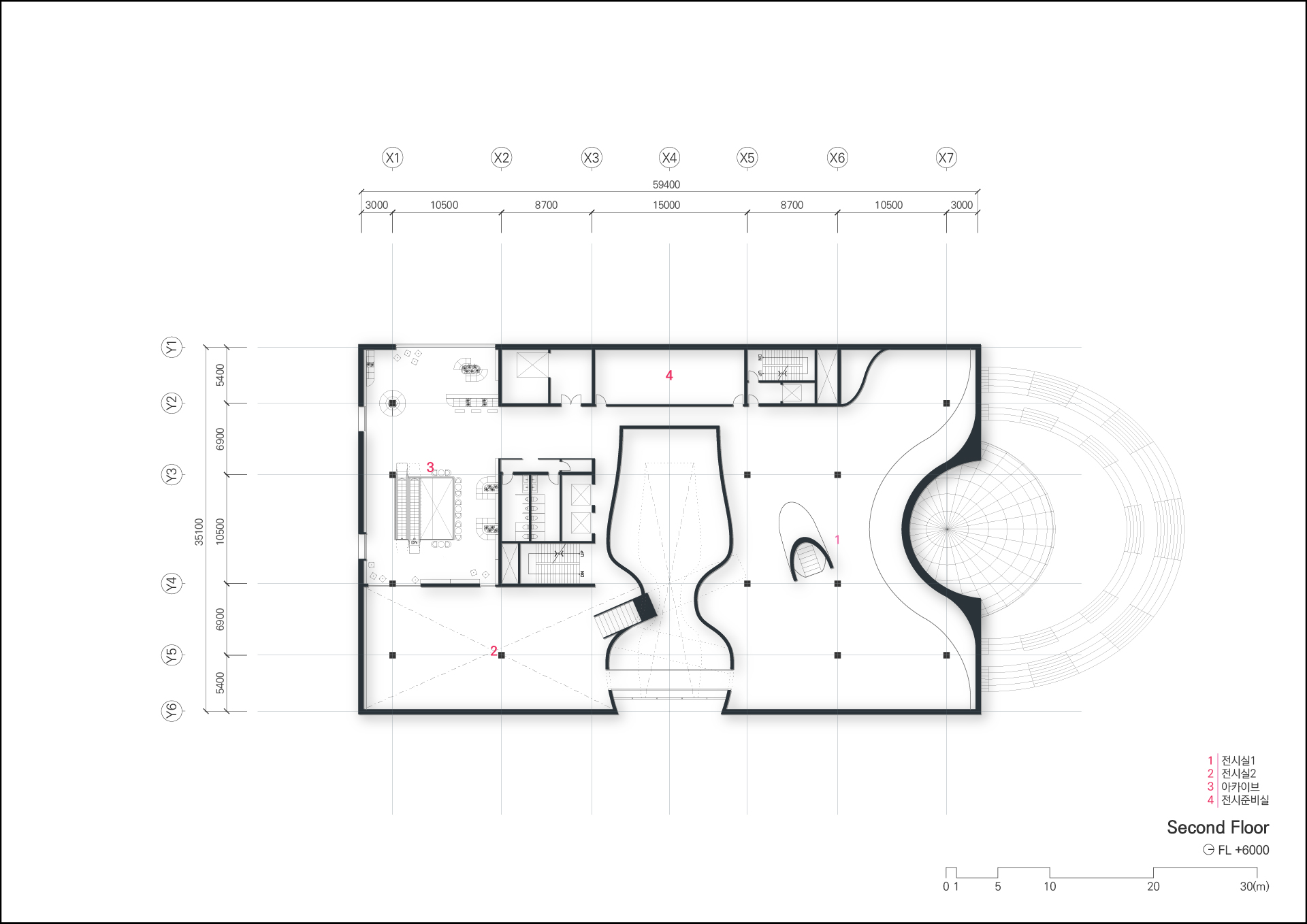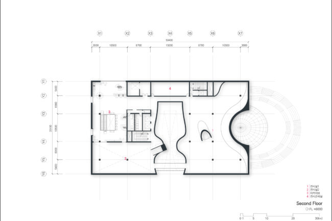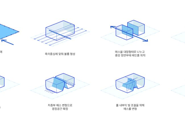 현재 사이트는 콘텐츠 거리라는 축과 중앙에서 만나게 된다. 중앙 공간은 전면이 유리로 이루어진 대공간으로, 건물 내외부에서 전시와 상호작용할 수 있도록 설계되었다. 이 대공간인 메인홀을 기준으로 빛이나 필요공간에 따라 매스가 디자인되었으며, 메인홀은 많은 변화가 일어나는 기획전시 공간으로 곡면으로 이루어진 벽이나 공중에 미디어 전시 및 홀로그램 전시가 가능하게 구성되었다.