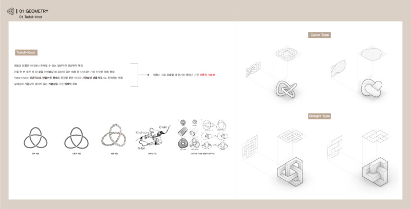 Trefoil Knot란 끈을 한 번 묶은 뒤 양 끝을 이어붙일 때 꼬임이 있는 매듭 중 가장 단순한 매듭 형태이며, 이러한 매듭이 서로 맞물릴 때 생기는 형태에 관심을 가지게 되었다.