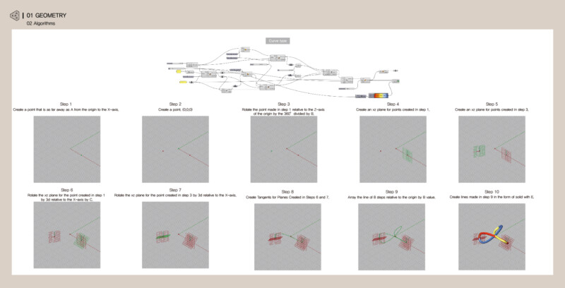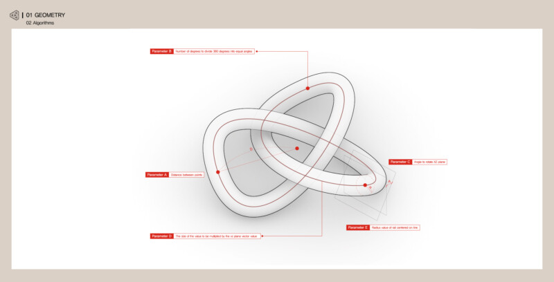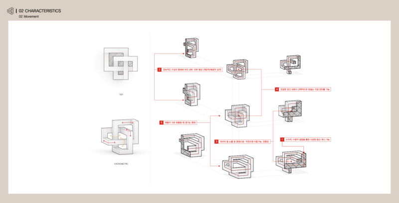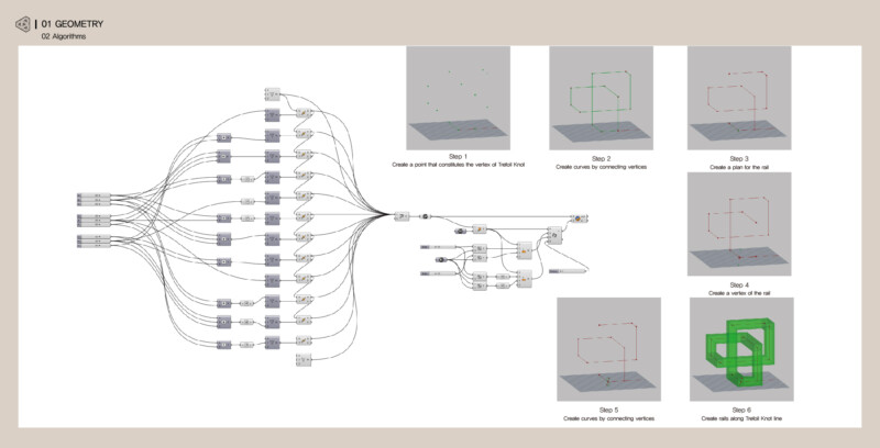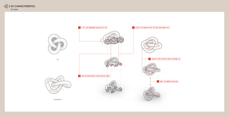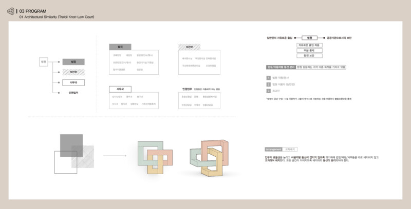 Trefoil Knot의 algorithm을 통해 수직적, 수평적 결합으로 다양한 동선 제시가 가능하다는 건축적 가능성을 발견했고, 이는 업무의 효율성을 높이고 이용자별 동선이 겹치지 않도록 하는 법원과 물리적/비물리적인 유사성을 가진다.