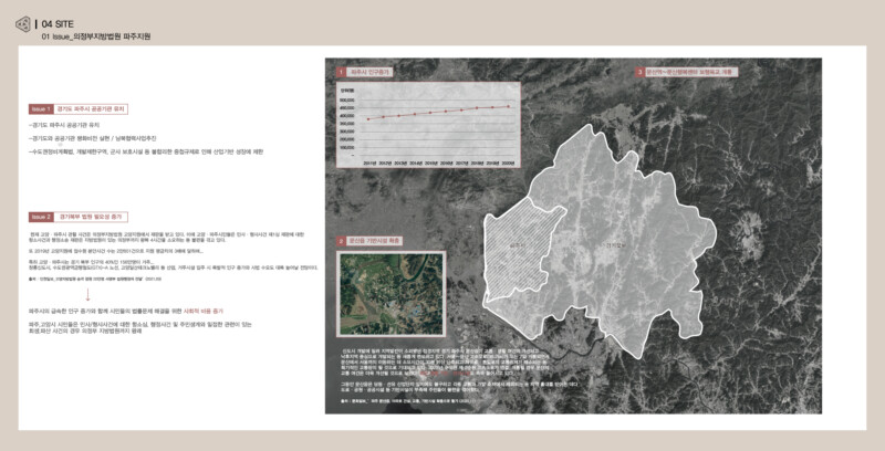 현재 파주시의 급속한 인구증가와 함께 시민들의 법률문제 해결을 위한 사회적 비용이 증가하고 있고, 이로 인해 경기 북부 법원의 필요성이 증가하고 있다. 경기 파주시 문산읍은 최근 생활 기반 편의시설이 들어서고 있고, 교통•생활 여건이 개선되고 낙후지역 중심으로 개발되는 등 새롭게 변화하고 있다. 따라서 사이트를 경기도 파주시 문산읍으로 설정하여 의정부지방법원 파주지원 프로젝트를 진행하였다.