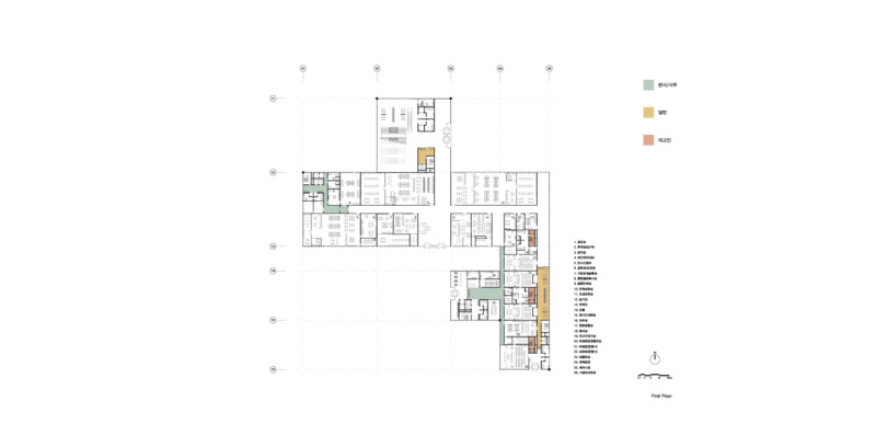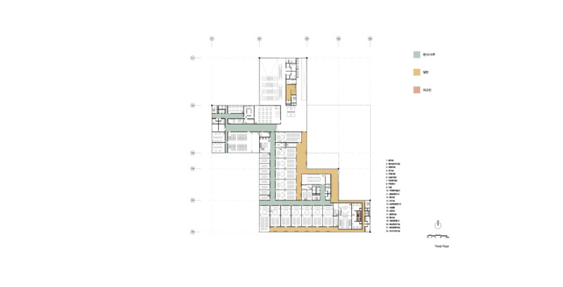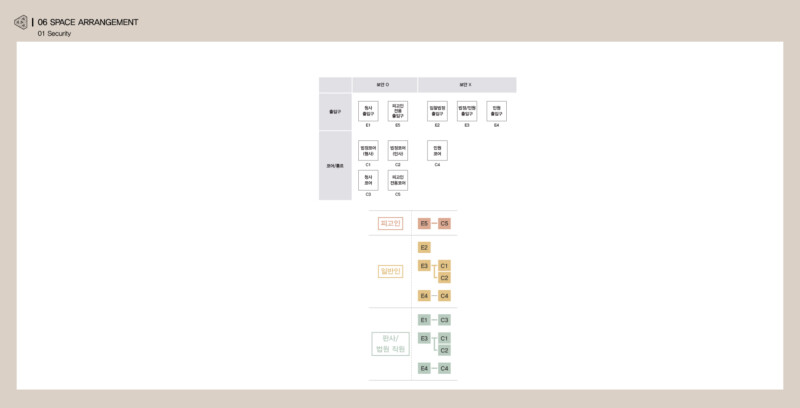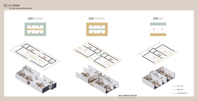 법원은 보안과 안전상의 이유로 업무와 사용자에 따라 공간과 동선이 분리되어야 한다. 이에 따라 Trefoil Knot의 형태를 통해 동선의 컨트롤이 가능하도록 했다. 피고인, 일반인, 판사/법원 직원의 동선을 수평적 요소인 복도와 수직적 요소인 수직 통로를 통해 한 공간을 사용하지만 동선이 분리될 수 있도록 했다. 또한 법정 중심구역, 업무 중심구역, 민원업무 중심구역, 업무지원구역으로 업무별로 각 공간을 구분하여 업무의 효율을 높이고 사용자별 동선이 겹치지 않도록 했다.