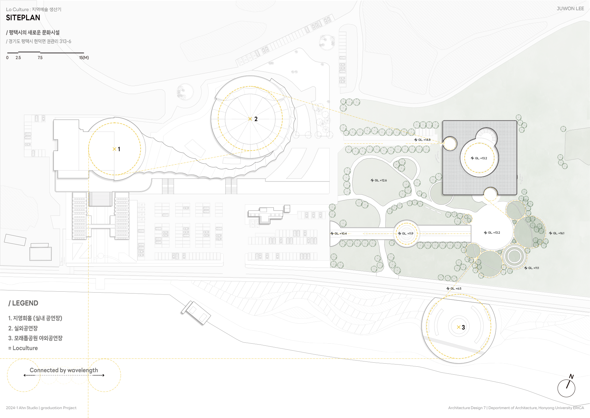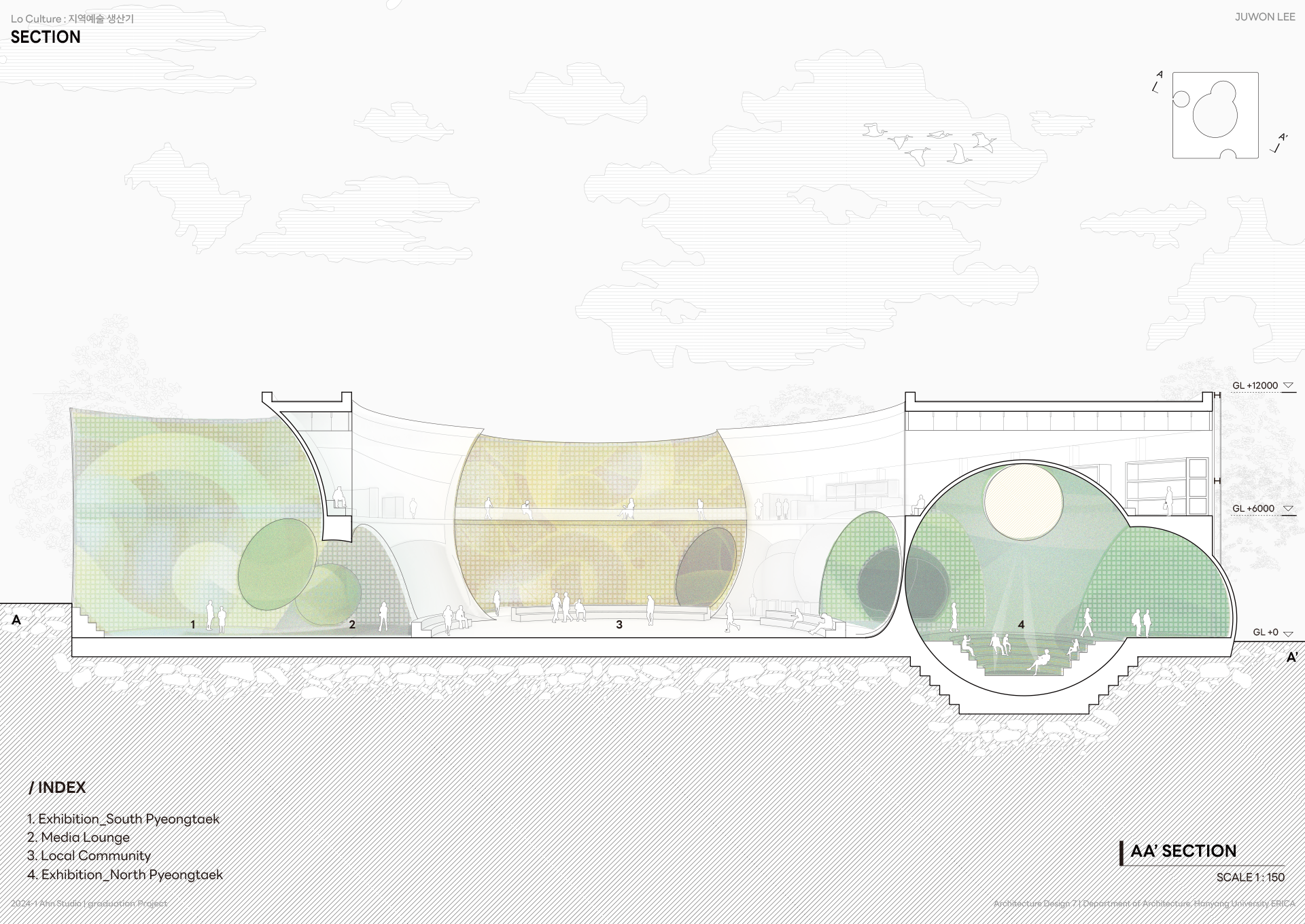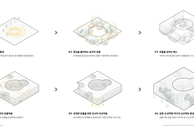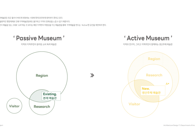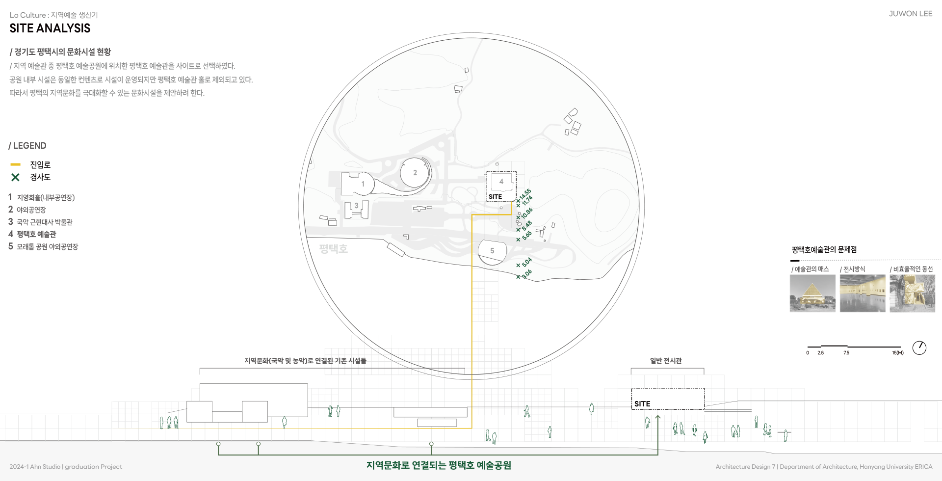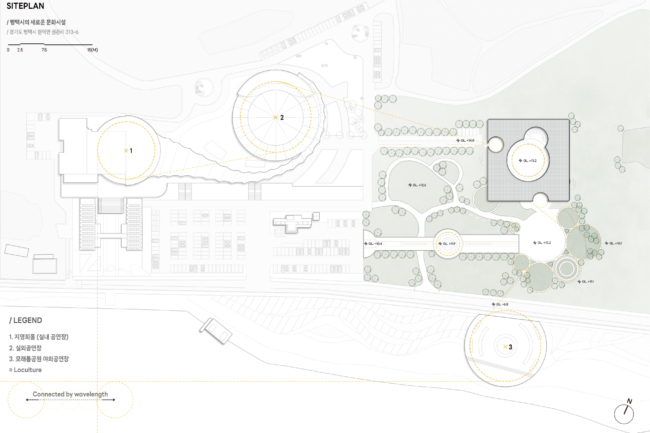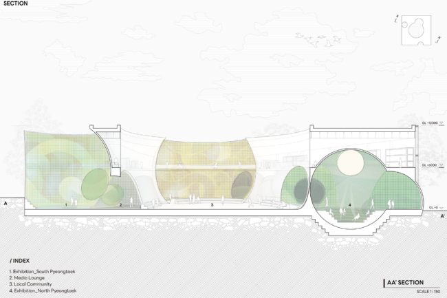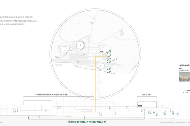 기존에 평택호 예술관으로 향하는 세 개의 길을 주축으로, 세 개의 길은 서로 어우러지면서 파장을 만들어내어 전시관 내부로 흘러 들어가 농악의 흐름과 연결된다.