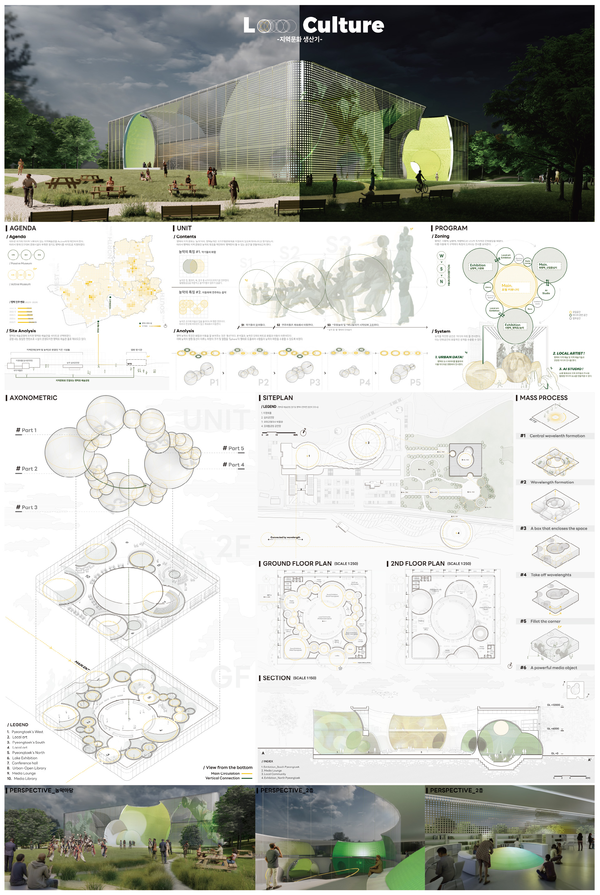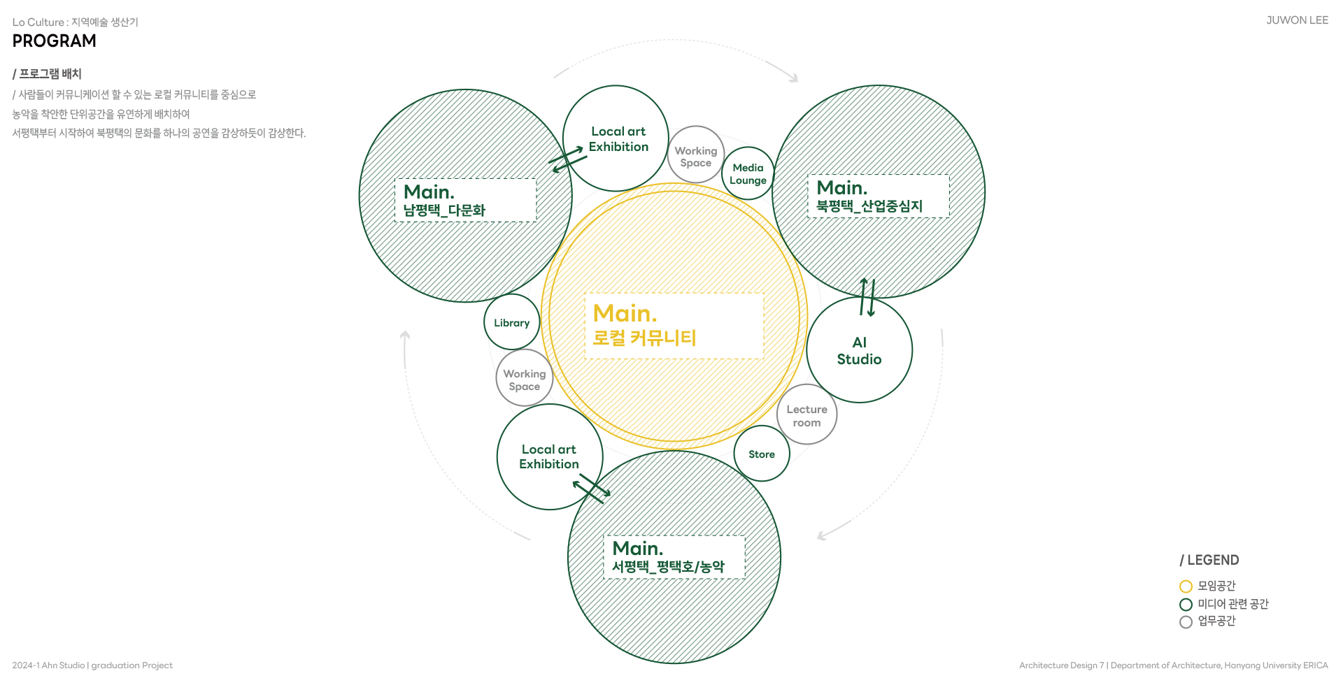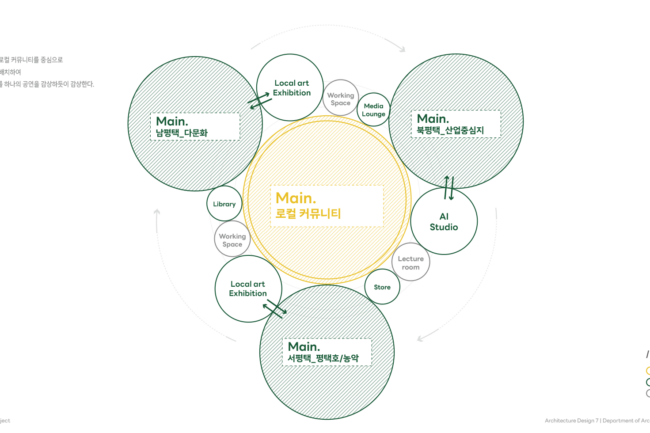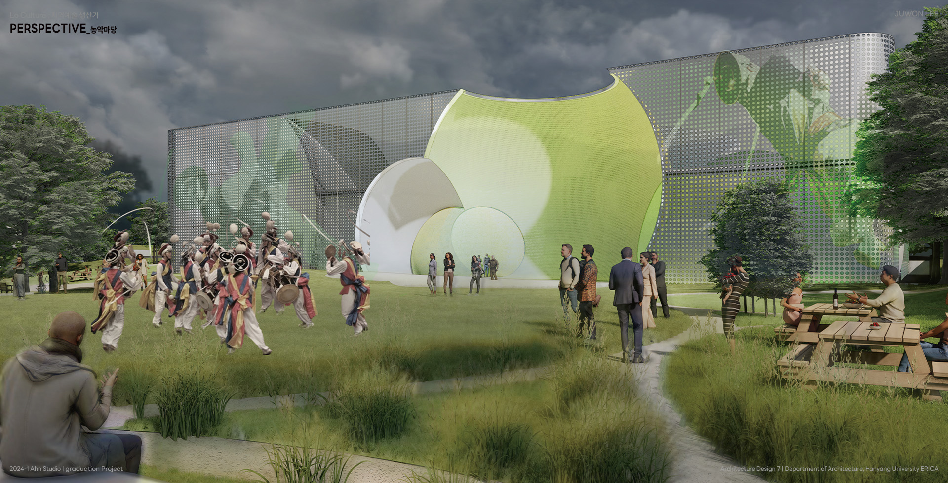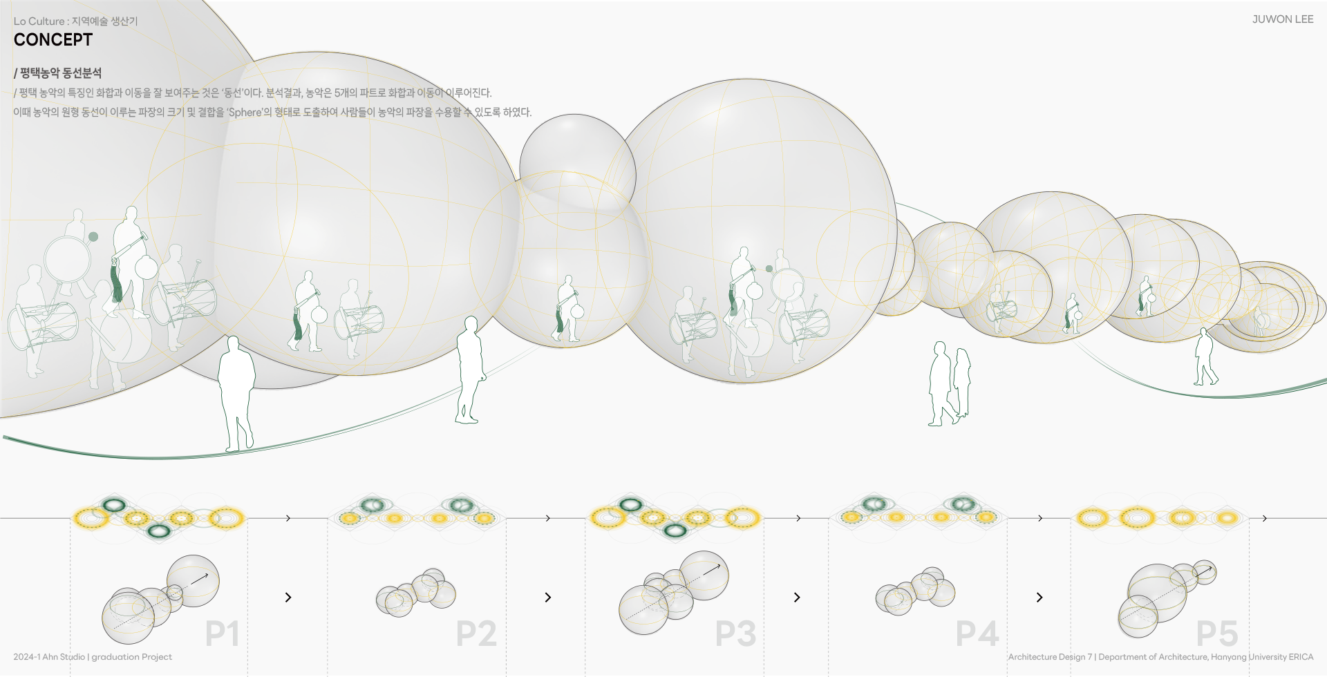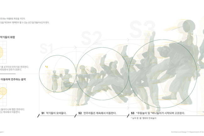 이러한 농악의 특징을 이용한 공간을 도출하여 지역 예술관에 활용한다. 농악의 원형 동선으로 이루어지는 파장을 평택 농악의 무대 동선에 대입하여 평택만이 가질 수 있는 ‘평택 농악의 로직’을 도출한다.