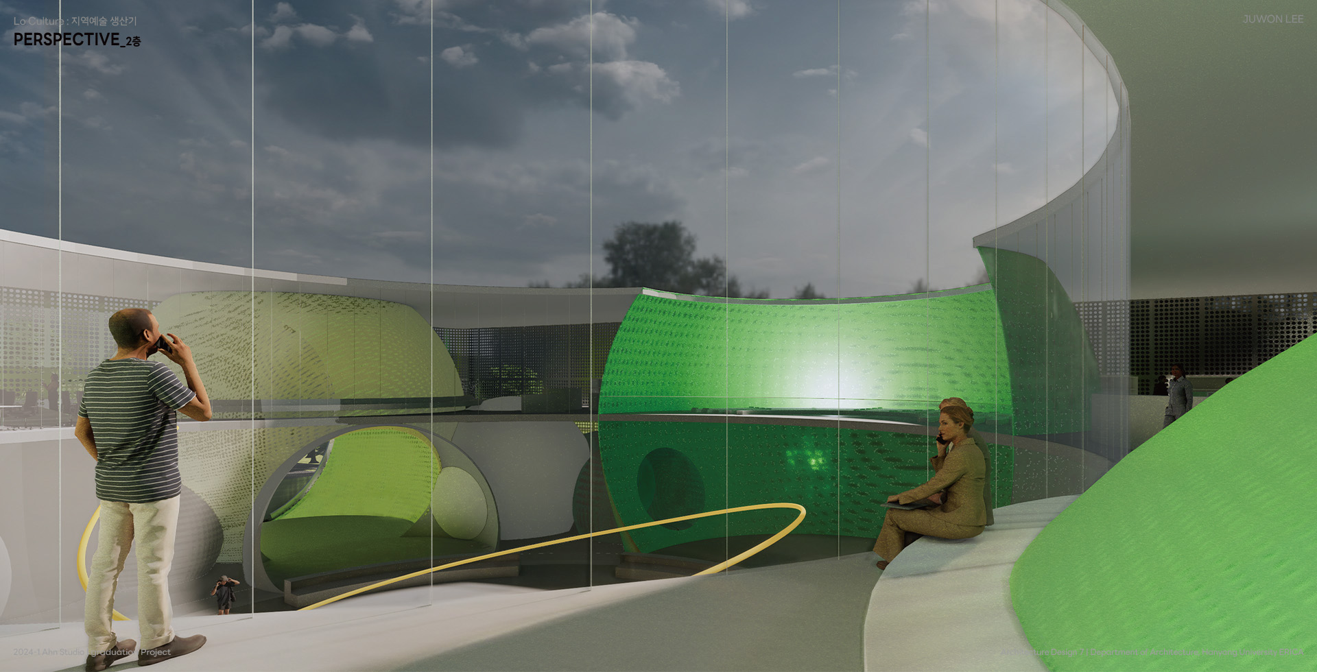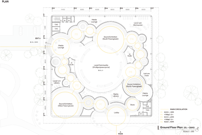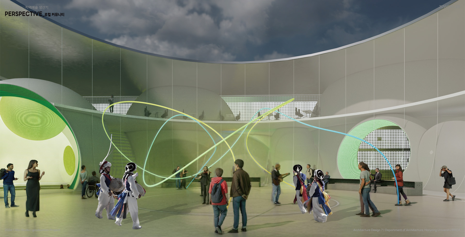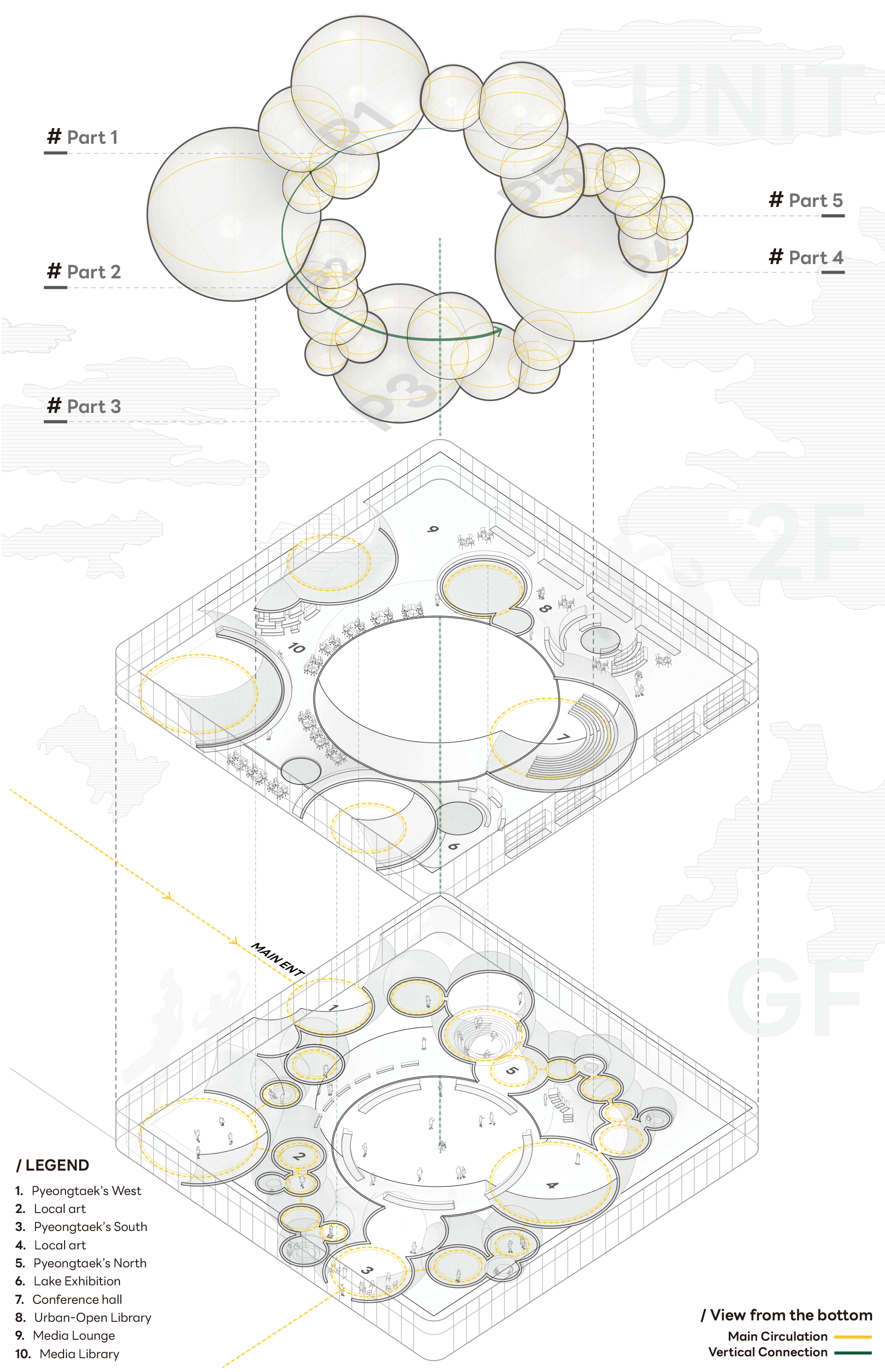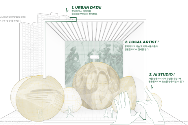 미디어 아트 전시관 내부에 활용되는 평택 농악의 흐름은 전시관 내부의 메인 전시 동선으로 활용한다. 농악을 차용한 공간은 각 쉘의 크기, 방향이 달라지면서 다양한 미디어아트를 수용할 수 있으며 농악에 대한 공간적인 체험을 하게 한다. 메인 전시를 이루는 쉘을 제외한 공간은 필요 공간으로서 도서관, 지역 예술 공간 등으로 활용되어 중심의 큰 커뮤니티 공간은 쉘과 필요 공간을 통합하는 지역 주민들의 소통 마당이 된다.