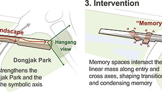 - 매스 상부는 한강 조망을 확보할 수 있도록 열려 있으며, 도심의 복잡한 도로 구조 속에서도 방향성과 상징성을 드러냄
