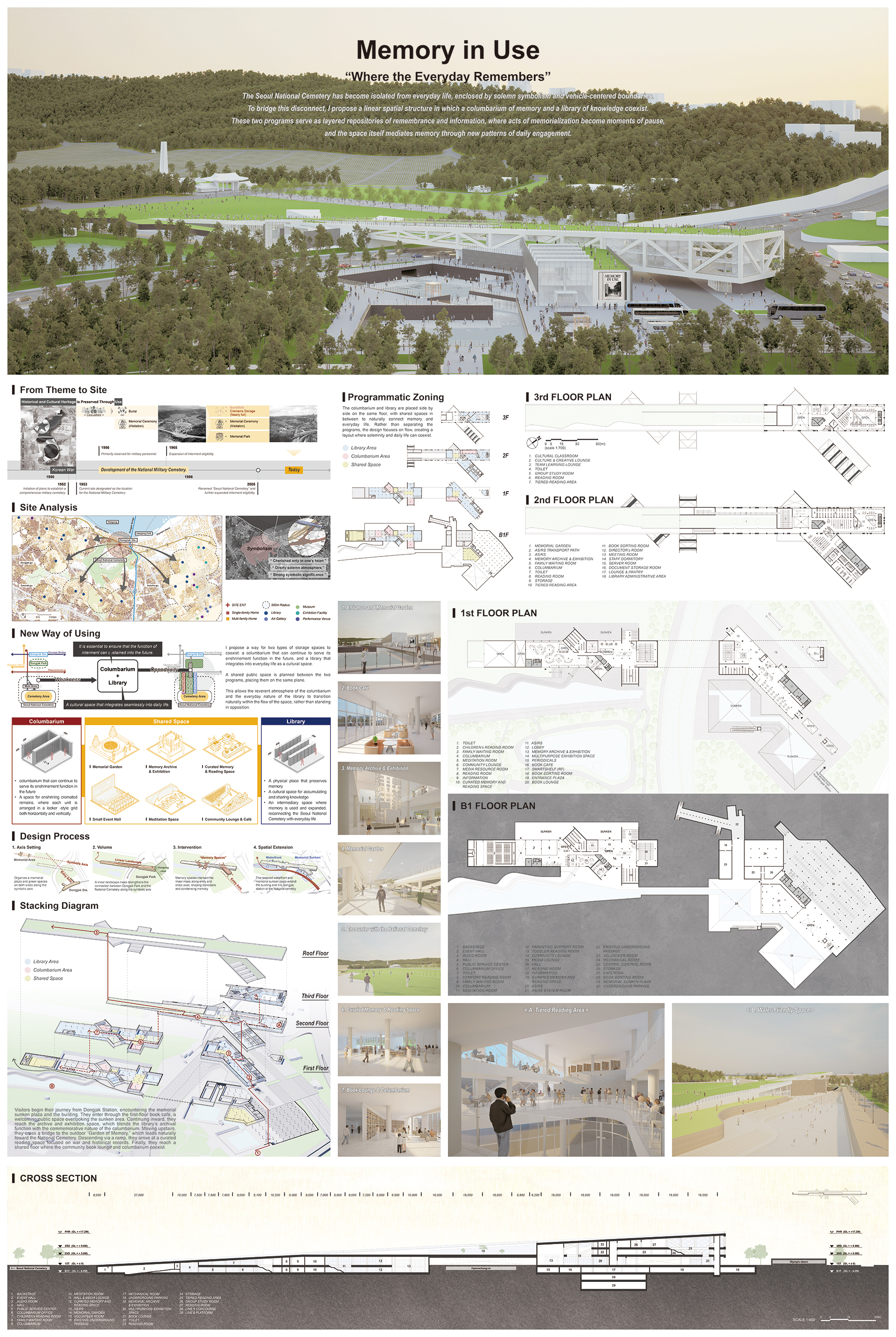 해법으로는 기억을 보존하는 납골당과 지식을 공유하는 도서관이라는 두 저장 공간의 공존을 제안한다. 이들은 모두 ‘기억’을 저장하는 장소로, 추모와 일상이 자연스럽게 이어질 수 있는 구조를 형성한다.
