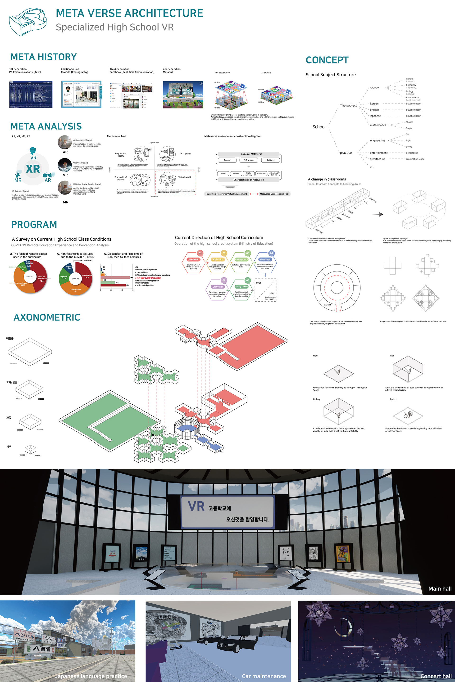 메타버스인 만큼 체험을 통한 교육을 하고자 하였으며 그로 인하여 주로 실습을 진행하는 특성화 고등학교로 진행하였고 일반 학교의 교실의 경우 일자 형태로 학생이 주가 되는 공간이지만 이를 변형하여 과목이 주가 되도록 공간을 일자형태에서 분해하여 각자의 교과마다 교실(공간)을 가지도록 하였다. 공간을 실습실 교과실로 나누어 구성하였으며 실습실은 주로 직접 VR기기를 통해 분해하고 조립하는 체험형으로 공간과 프로그램을 구성하였고 교과실 같은 경우는 전시관 형태로서 수업을 진행할 수 있도록 설계하였다.