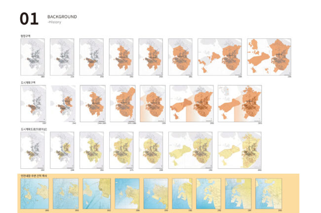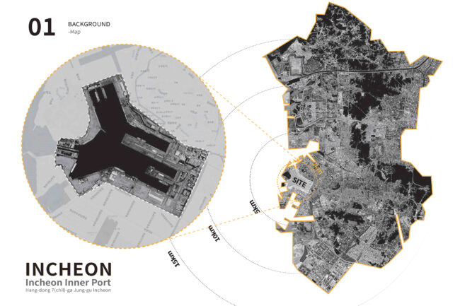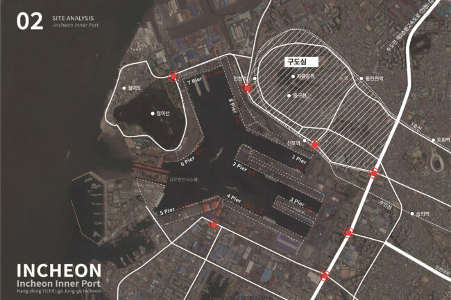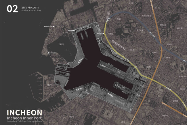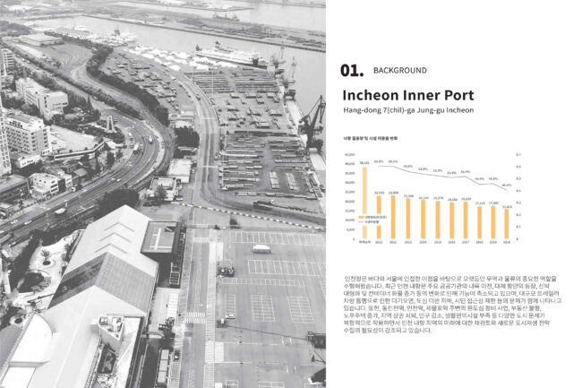 대상지는 인천내항 마스터플랜 수립 이후, 도시와 항만 사이의 실질적 연결을 구현하기 위한 핵심 지점으로 선정되었습니다. 해당 부지는 원도심과 1·8부두 사이를 가로지르는 구 화물철도 인입선으로, 과거에는 내항의 물류 기능을 담당하던 기반시설이었습니다. 그러나 항만 기능의 축소와 함께 현재는 운행이 중단된 채 도심과 수변을 가로막는 물리적 장벽으로 남아 있습니다.