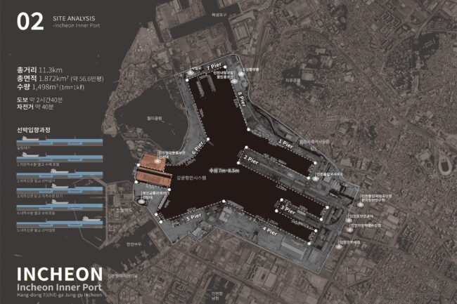 또한 내항은 수도권 제2순환고속도로, 경인고속도로, 경인선 철도 등 광역 교통망과 연결되어 수도권 어디서나 쉽게 접근할 수 있습니다. 바다와 도심이 맞닿아 있으면서 원도심과 함께 성장해 온 항만으로서, 내항은 산업과 도시, 수변이 독특하게 중첩되는 특별한 입지를 갖추고 있습니다.