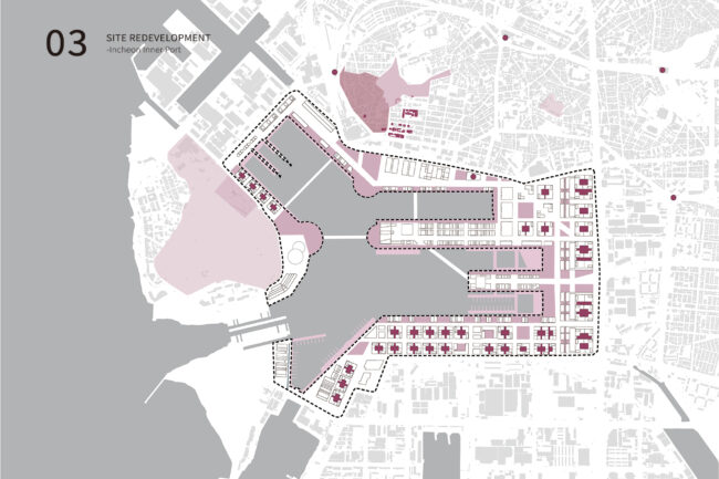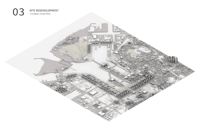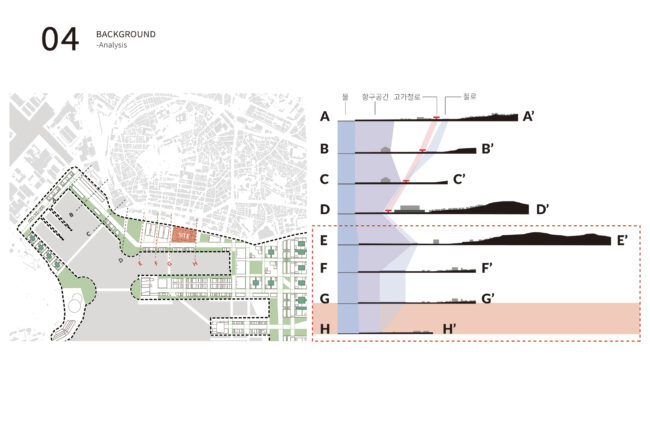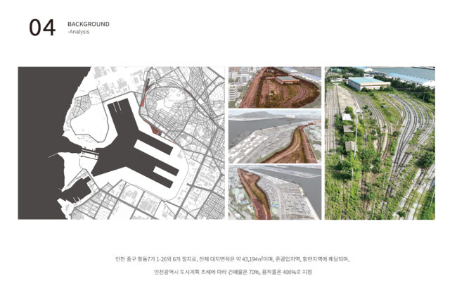 선형의 이 부지는 내항과 도심을 가장 직접적으로 접하는 지점에 위치하며, 고도차와 펜스, 철로 흔적 등이 보행 단절을 더욱 심화시키고 있습니다. 하지만 동시에, 이러한 폐철도 부지는 도시의 흐름을 회복하고, 새로운 프로그램을 통해 주변 지역과의 관계를 재정립할 수 있는 전략적 여유지이기도 합니다.