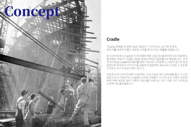 본 프로젝트에서 Cradle은 인천내항의 해양 산업 유산을 현대적으로 계승하여, 물리적인 ‘요람’의 개념을 새로운 창업과 혁신의 플랫폼으로 확장합니다. 과거 선박이 Ship Cradle에서 형태를 갖추고 바다로 나아갔듯이, 이제 이 공간은 청년 창업자와 창작자가 아이디어를 실험하고 협업하며 세상으로 나아갈 수 있도록 지지하는 도시적 성장 기반이 됩니다.
