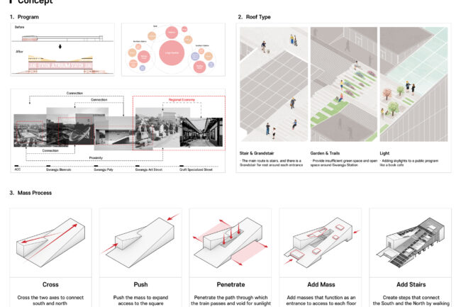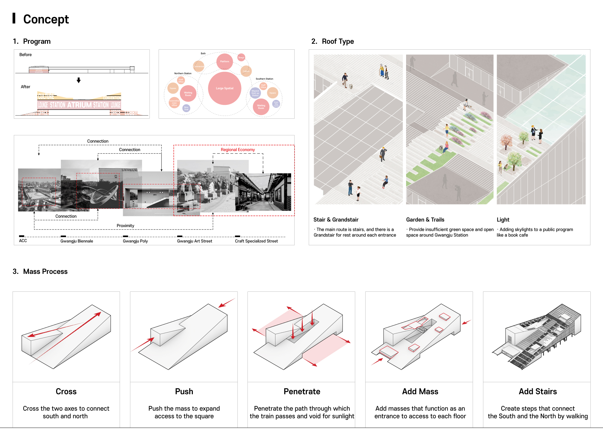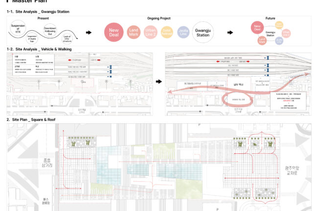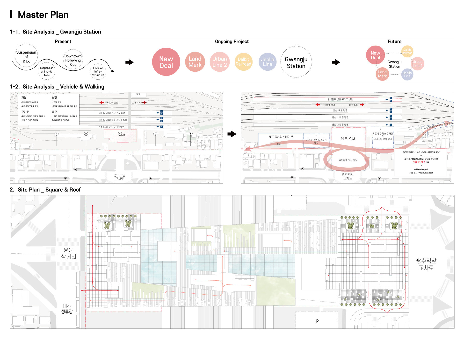 그래서 광주역의 철도 역사 기능을 복원하고, 보행 환경에 초점을 맞춰서 광주역이 광주의 새로운 랜드마크로 작동할 수 있는 방향으로 프로젝트를 진행하였다.