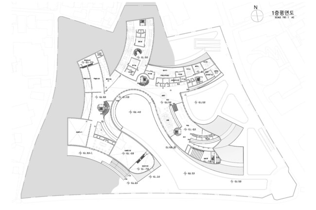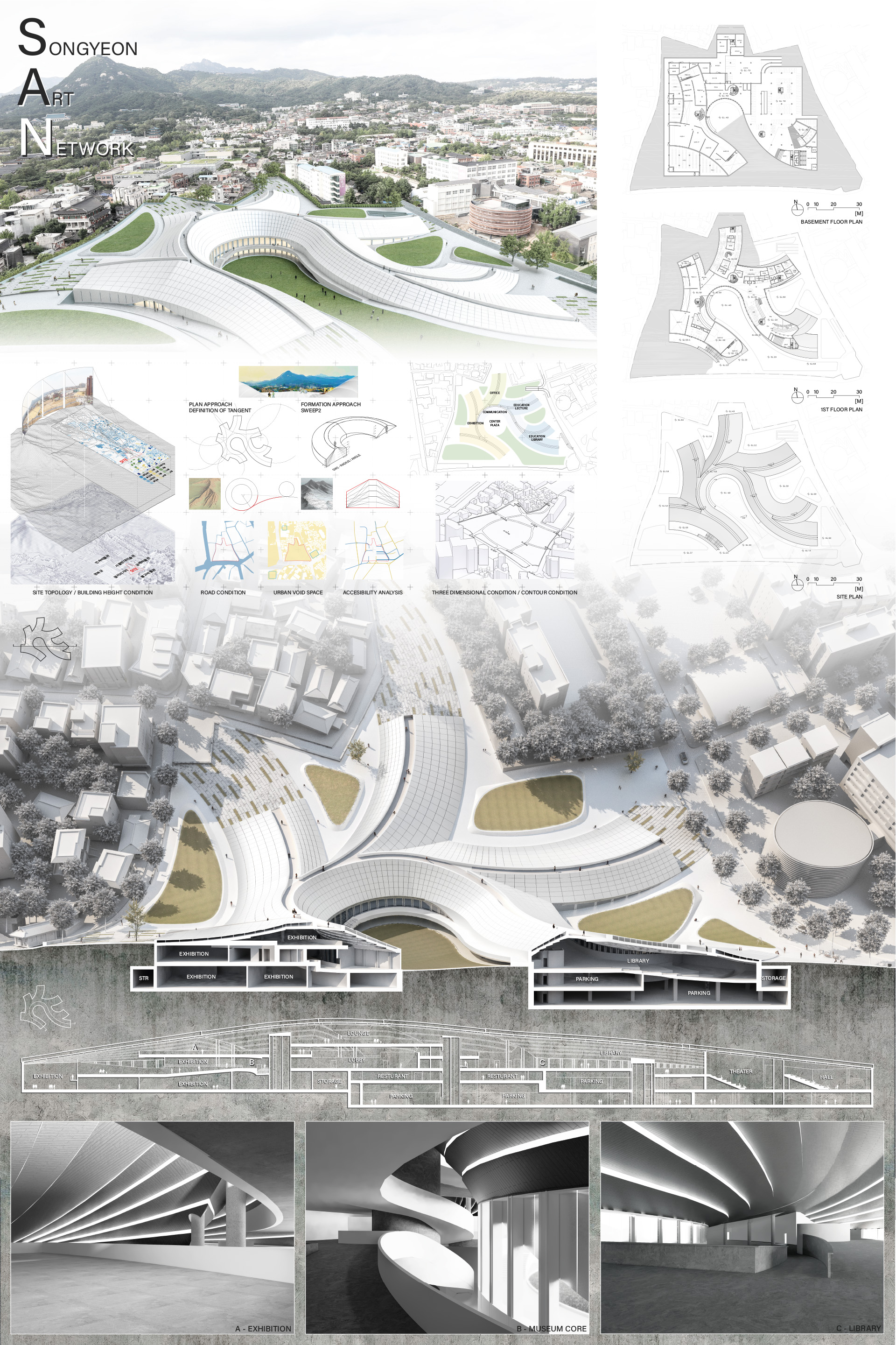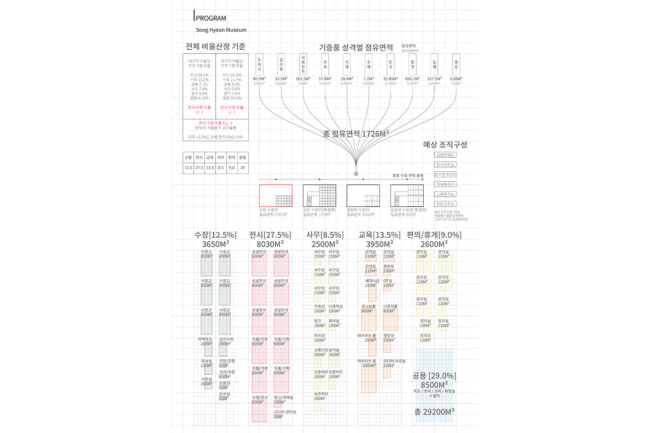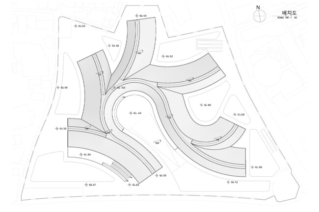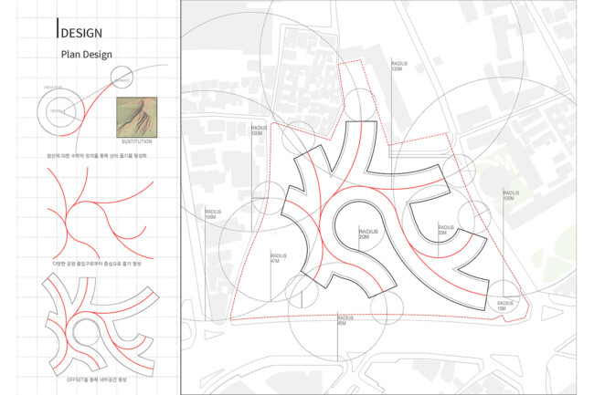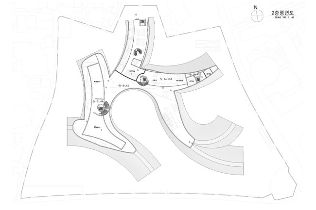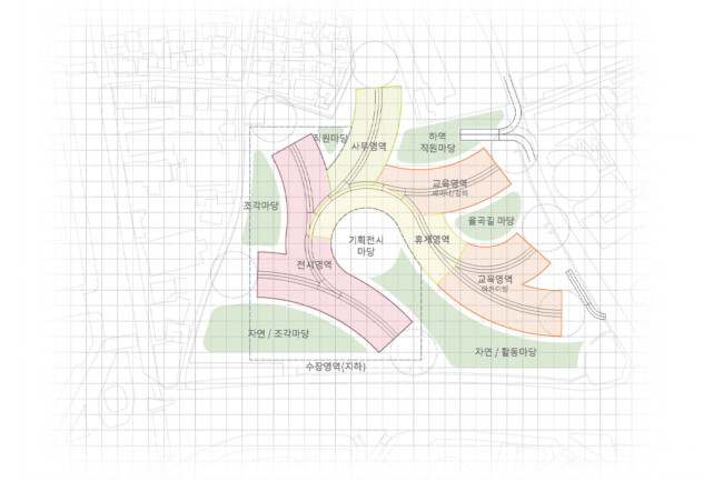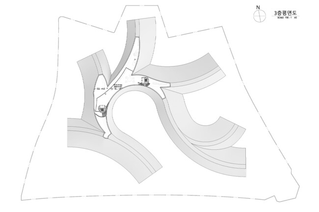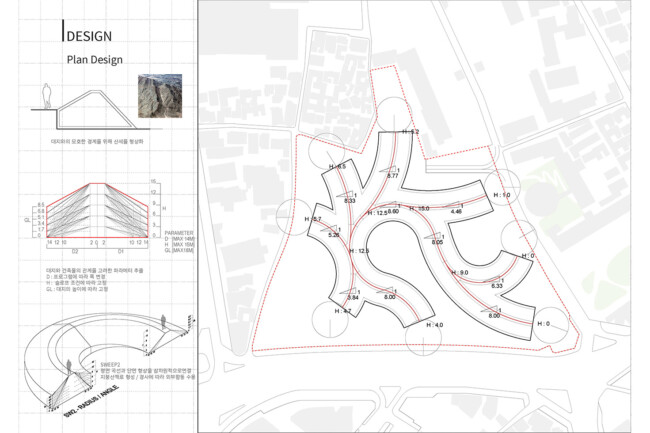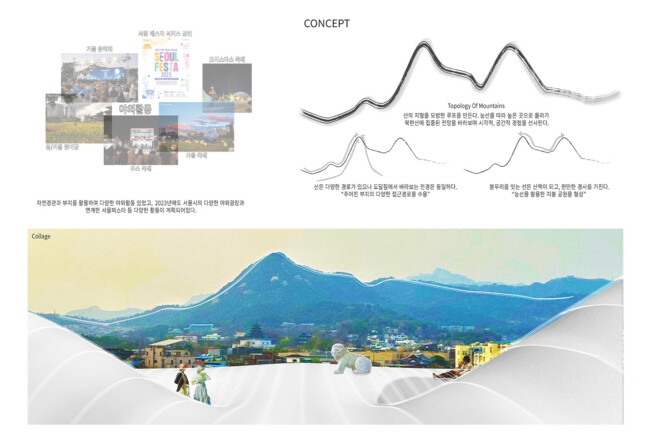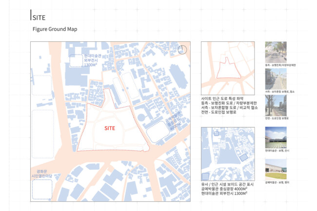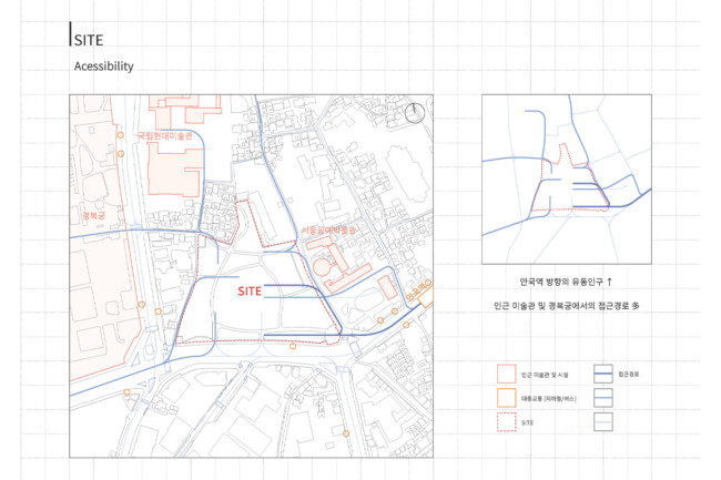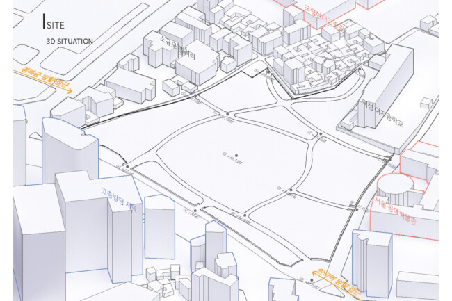 서울 중구 경복궁 옆에 위치한 송현동 부지는 조선시대에서 현재에 이르기까지 거친 역사 속에서 보존된 부지이다. 조선 왕가의 사유지, 일제시대 친일파 주거지, 미군 거주지, 기업 자본 전략을 위한 부지를 지나 주변경관 및 시설에 따른 법적규제를 통해 현재는 서울시에서 해당 부지를 매입한 상태이다. 서울시는 역사성과 공공성을 고려하여 ‘송현동 열린녹지광장’ 계획을 통해 해당부지를 공원화하였고, 2027년까지 이건희 기증관(가칭)을 설립하여 서울시 중구에 위치한 여러 국립미술관과 연계한 문화공원 조성을 위한 계획을 수립중이다. 여기서 기증관이 될 건축물에 있어 현재 도시에서 공원인프라로 작용하고 잇는 송현동열린녹지광장의 쓰임은 중요한 고려사항이 된다. 건축물이 구축된 후에도 현재 광장에서 발생하는 시민들의 야외활동을 수용할 수 있어야하기 때문이다. 따라서 이러한 공원의 성격을 유지하면서도 건물의 용도를 실현하기 위해 위에서 언급한 건축과 지형의 모호화된 경계를 제안하고자 한다. 건물의 지붕과 지형에 연속성을 부여하여 외부 동선과 행위를 수용하고자 한다.