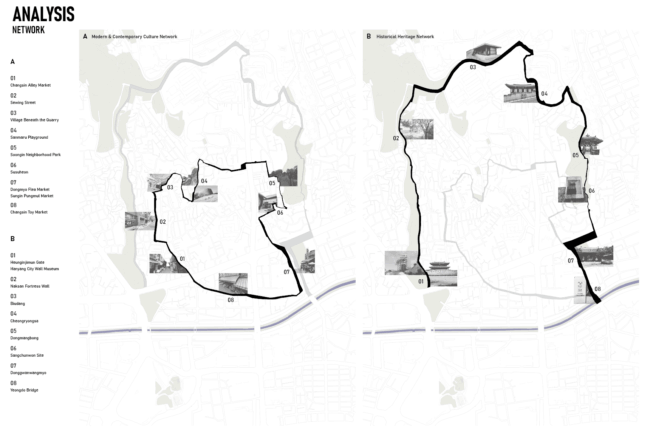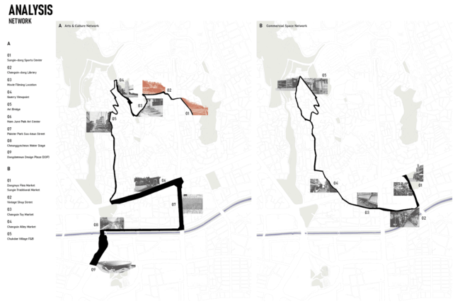 프로젝트 진행에 앞서 해당 지역을 활성화 기반을 위해 숨겨진 명소 또는 역사적으로 유서깊은 장소들을 모색하였고, 본 사이트와의 네트워크를 시각화한 지도를 만들었다.