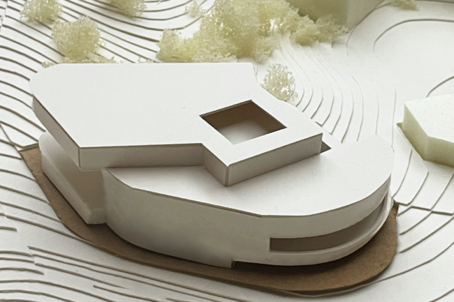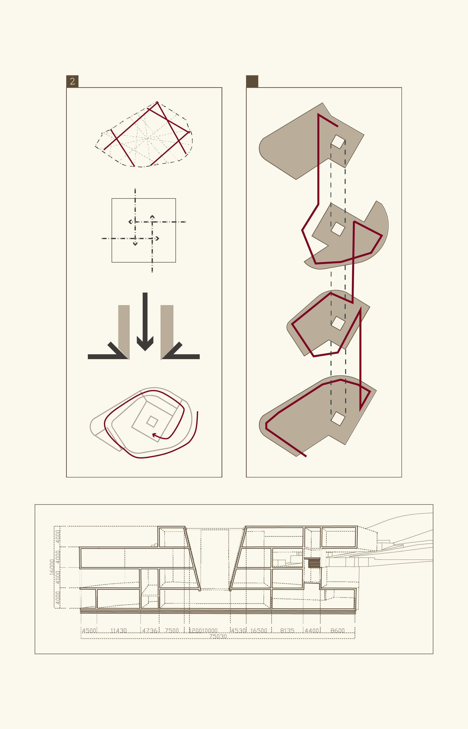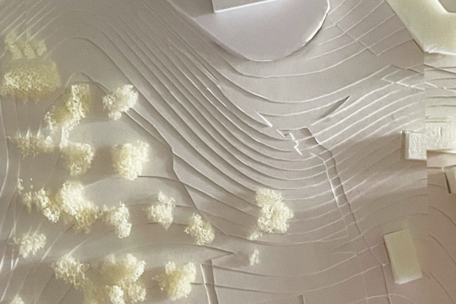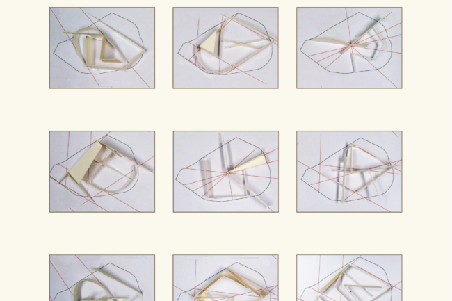 1. 도심지로부터 이 공간으로 끌어당기는 여러 가지 선들을 공간을 구현하기 위한 축으로 활용한다. 모형 스터디를 통해 수많은 축들 중 건축적 레이어로 발전 가능한 소수만 선택했고, 공간의 기본 컨셉을 구현하기 위한 단계를 진행했다.