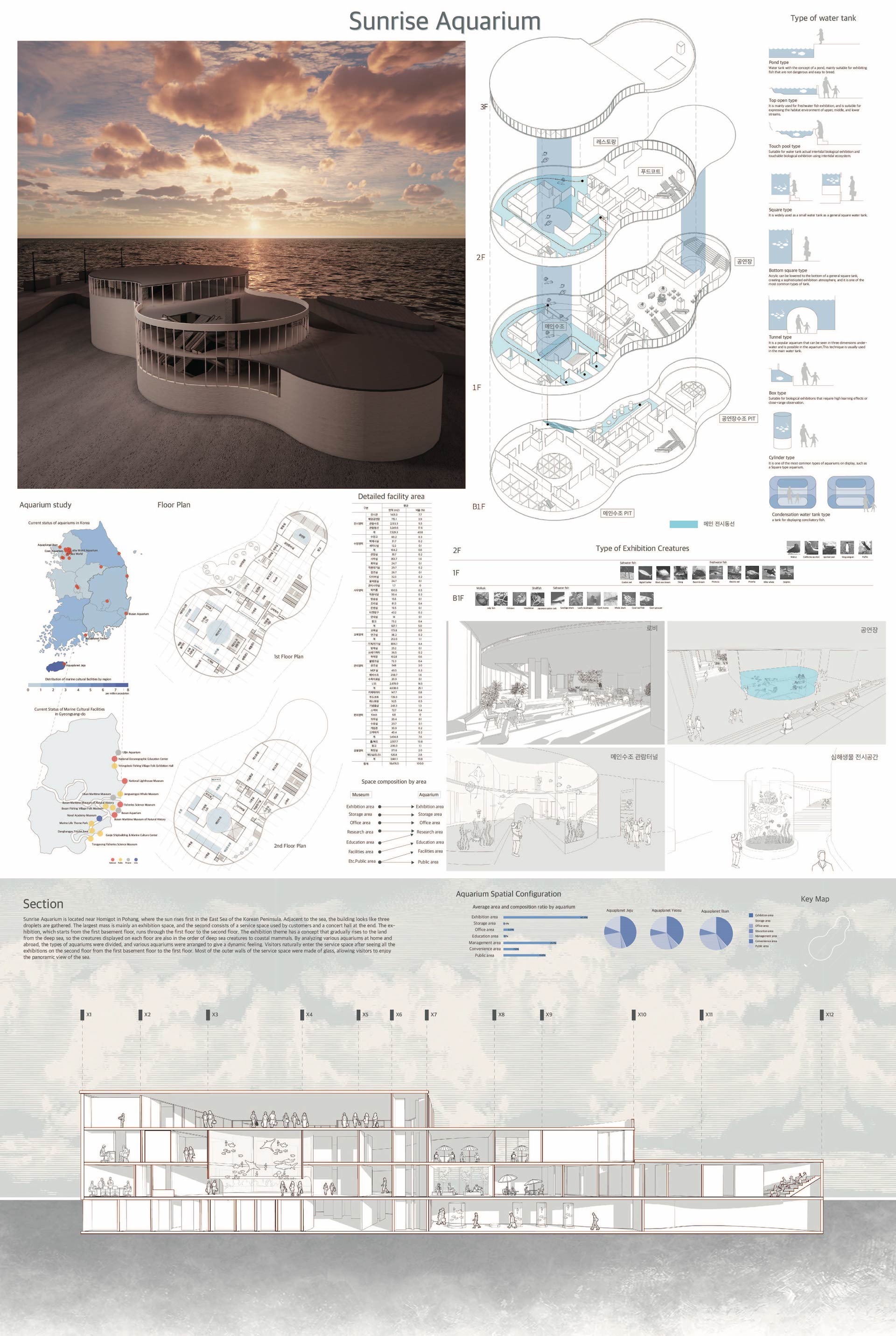 Sunrise Aquarium은 한반도 동해에 가장 먼저 해가 뜨는 포항 호미곶 근처에 위치한다. 바다와 인접해 있는 이 건물은 3개의 물방울이 모여있는 듯한 모양을 가지고 있다. 가장 큰 매스는 전시공간이 주를 이루며, 2번째는 고객들이 이용하는 서비스 공간, 마지막은 공연장으로 이루어져 있다. 지하 1층부터 시작되는 전시는 1층을 거쳐 2층까지 이어져있다. 전시테마는 심해에서부터 점점 육지로 올라오는 컨셉을 가지고 있어서, 각 층마다 전시된 생물 또한 심해생물부터 연안생물 포유류 순으로 되어있다. 국내외 여러 수족관을 분석하여 수조의 종류를 나누었고 다양한 수조를 배치함으로써 역동적인 느낌을 주고자 하였다. 관람객들은 지하 1층부터 1층을 거쳐 2층의 전시를 모두 본 후 자연스럽게 서비스 공간으로 진입한다. 서비스 공간은 외벽의 대부분이 유리로 되어있어 바다의 전경을 감상 가능하게끔 하였다.
