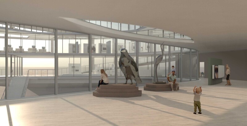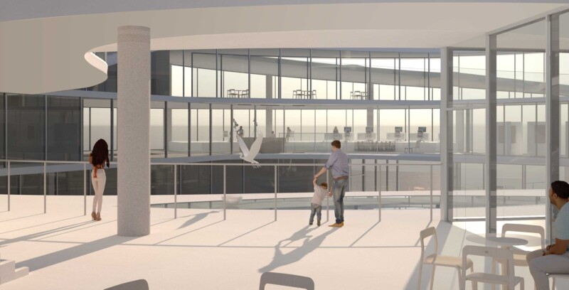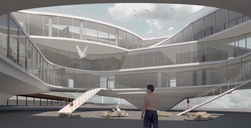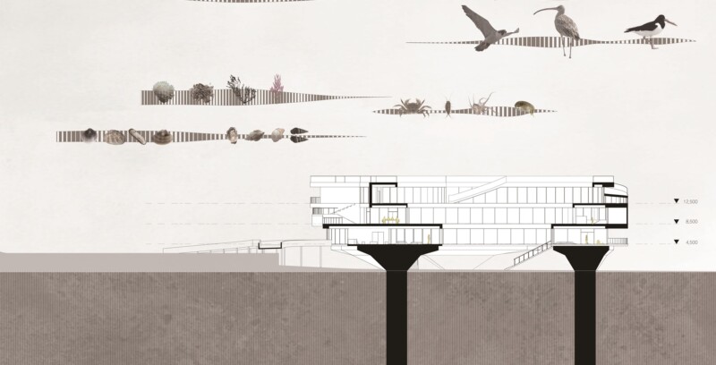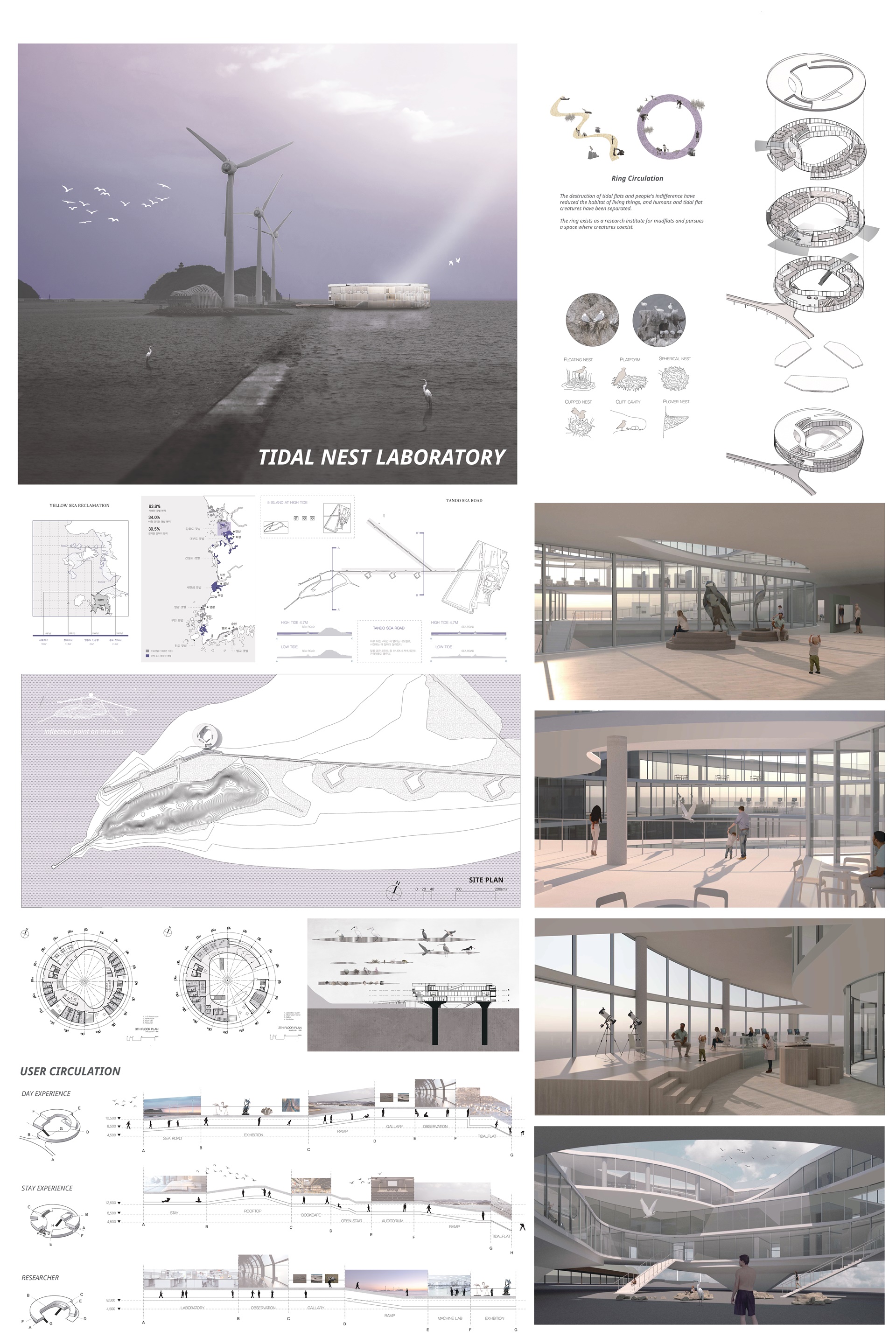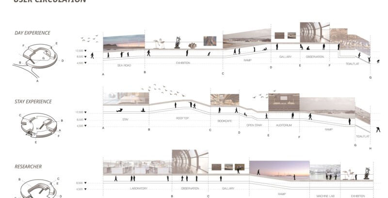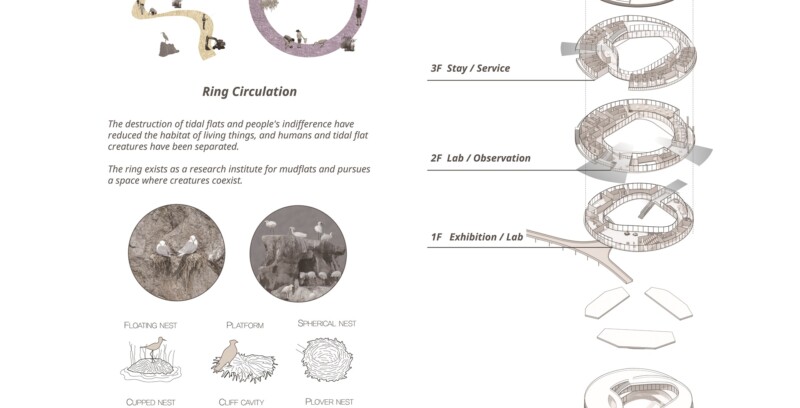 바다와 갯벌, 하늘을 물리적인 실체로 보고, 그 사이인 건물에서 새와 사람 물이 드나드는 공간으로 만들고자 했다. 원형의 형태는 자연을 닮은 형태에 대한 고민에서, 자연속에 묻히는 무작위 적인 곡선형 보다 건물이 원형의 인공적인 형태로 대비되며 존재하면서, 원형 공간의 유격사이로 자연이 스며들고 각기 다른 층의 원형 형태에서 생기는 접점에서 생물들이 해풍과 같은 자연환경에서 보호받을 수 있는 쉼터 공간을 형성하고자 했다.