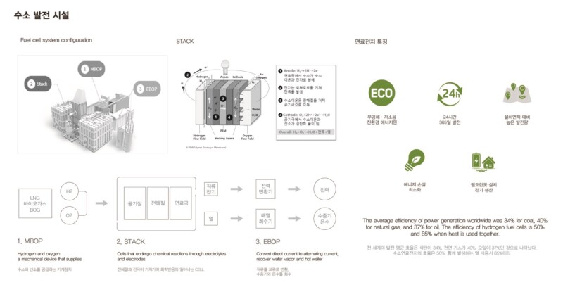 수소 연료전지는 수소와 산소의 전기화학반응을 통하여 전기와 열에너지를 생산하는 에너지 변환 장치이다. 장치의 구성은 수소와 산소를 공급하는 MBOP, 전해질과 전극이 거쳐가며 화학반응이 일어나는 STACK(연료전지), 생성된 직류를 교류로 변환하고, 수증기와 온수를 회수하는 EBOP로 이루어져 있다.