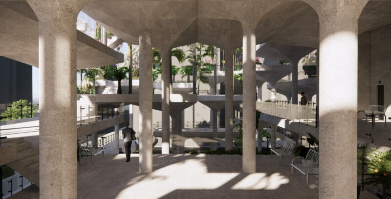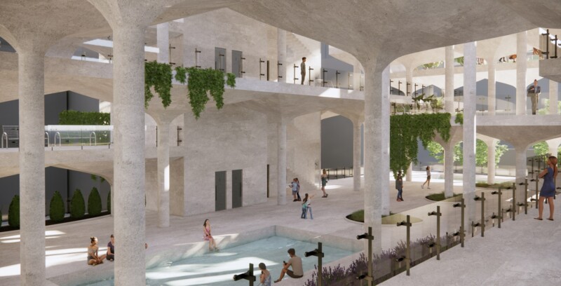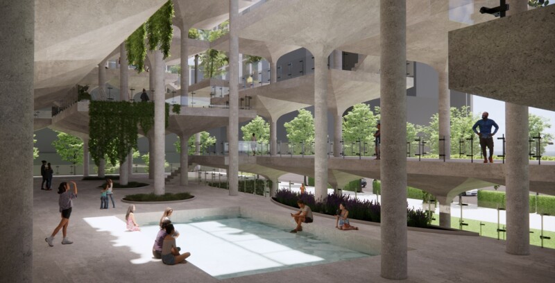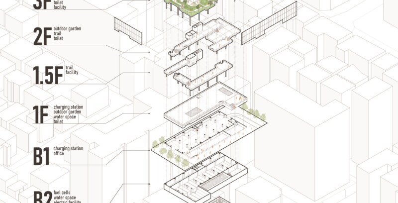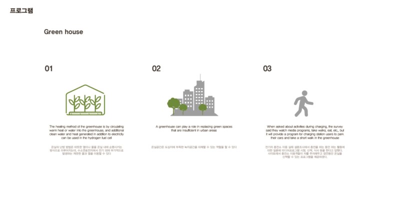 발전소가 도시에서 혐오시설로 인식되지 않게 하기 위해 지상층에는 사람들이 편안하게 사용할 수 있는 녹지와 수공간, 온실, 카페 등을 배치했고, 발전 시설과 충전소는 지하층과 Sunken 공간에 배치해 사이트 내부로 들어온 사람들 만이 볼 수 있게 배치하였다.