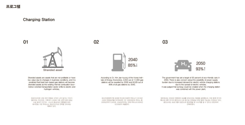 이 프로젝트는 주 에너지원이 수소로 전환되며 좌초자산화된 주유소 부지를 활용한 도심지 친환경 분산발전소 프로토타입을 제안한다.