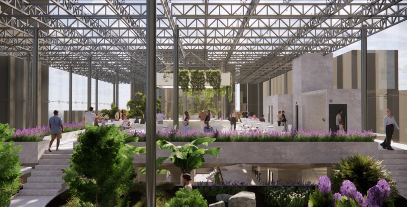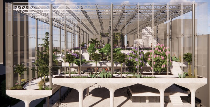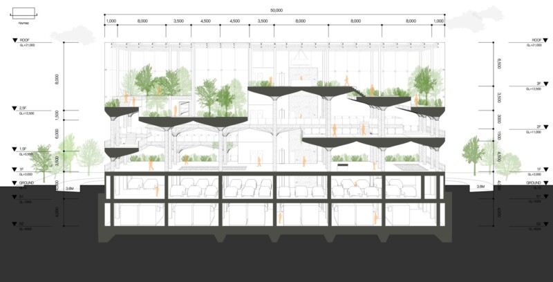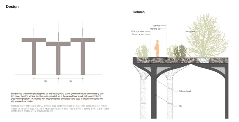 지하층에 위치한 발전 시설과 충전소 평면에 기둥을 배치하면서 만들어진 8m 간격의 그리드에서 수직 구조가 지상층으로 연장되어 온실 프로그램과 자연스럽게 연결되게 했고, 기둥과 슬라브가 일체화 된 PC 모듈을 사용해 다양한 층고의 연결된 동선을 만들어내도록 했다.